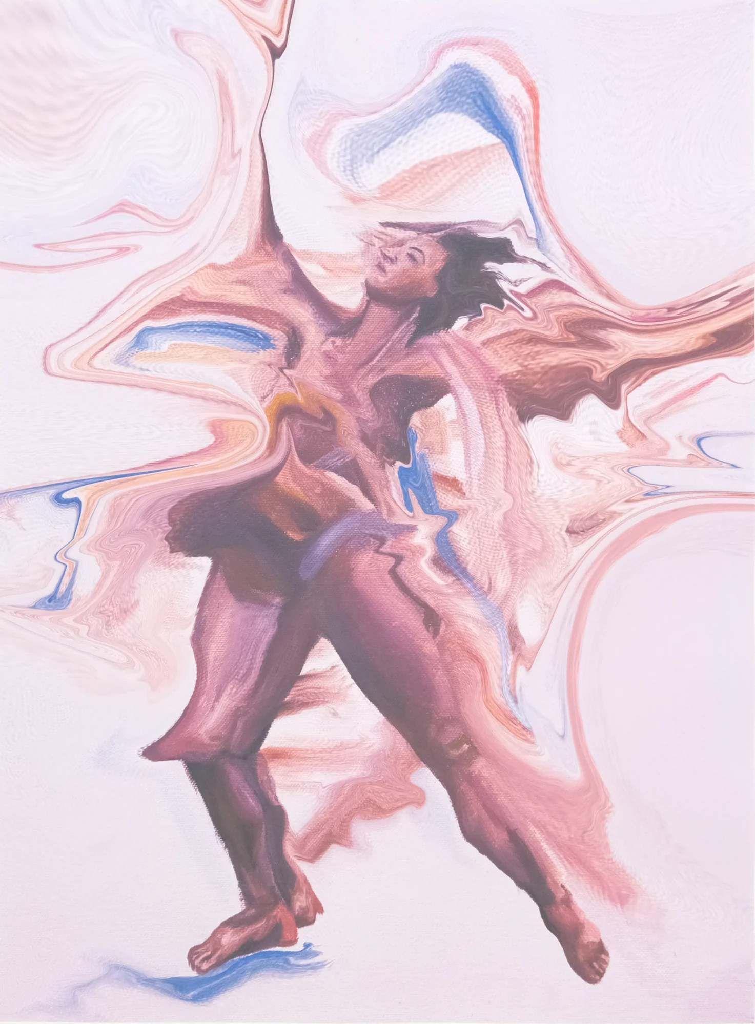 What is the purpose of life when we are just temporary visitors in this world? The randomly fading and emerging forms create a sense of absence within presence, emphasising that our existence is only momentary. The chaotic layering of the bodies symbolises our inner conflict in search of the meaning of existence. The swirls and curves, portrayed through the thick brushstrokes, reflect the movement of the wind – a natural force that exists only as it moves, yet is always present, like human life.