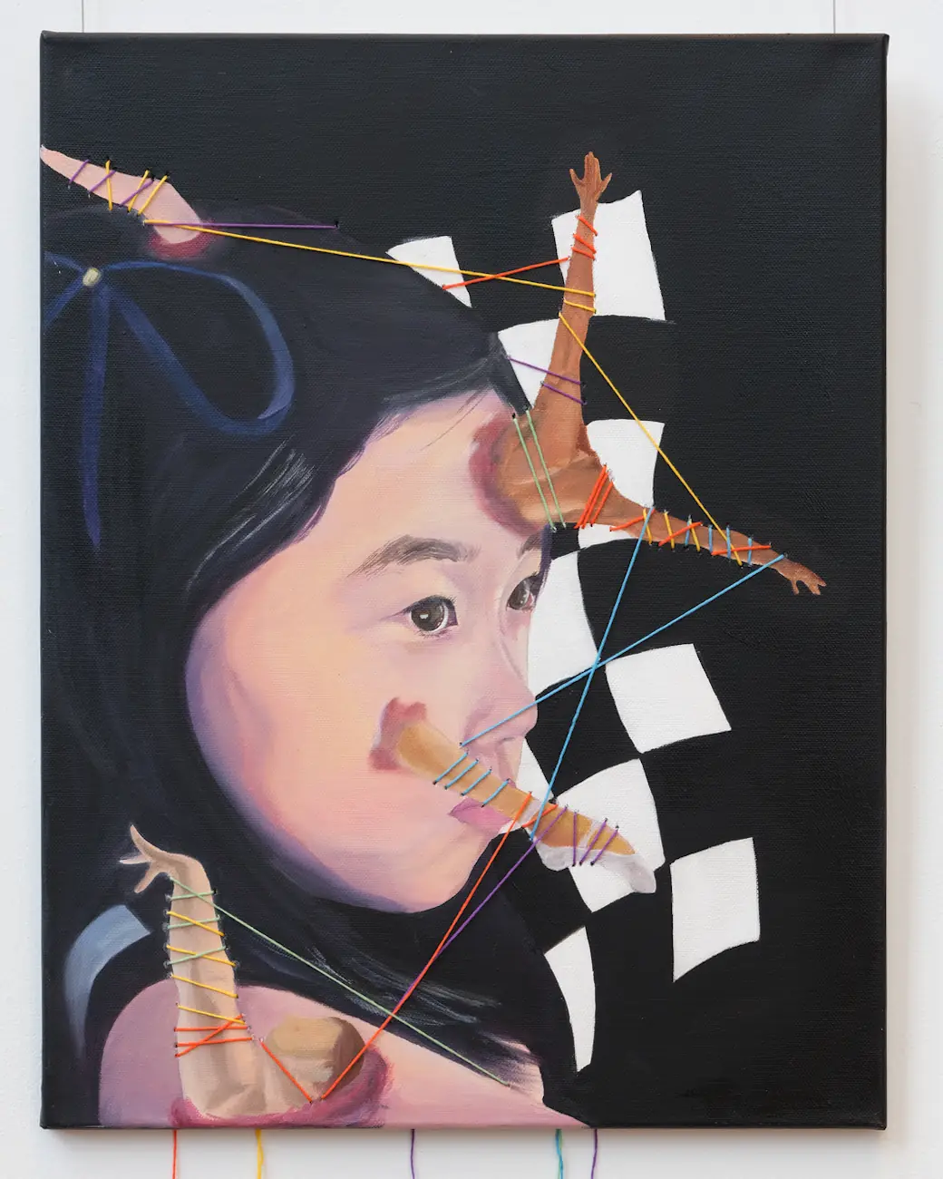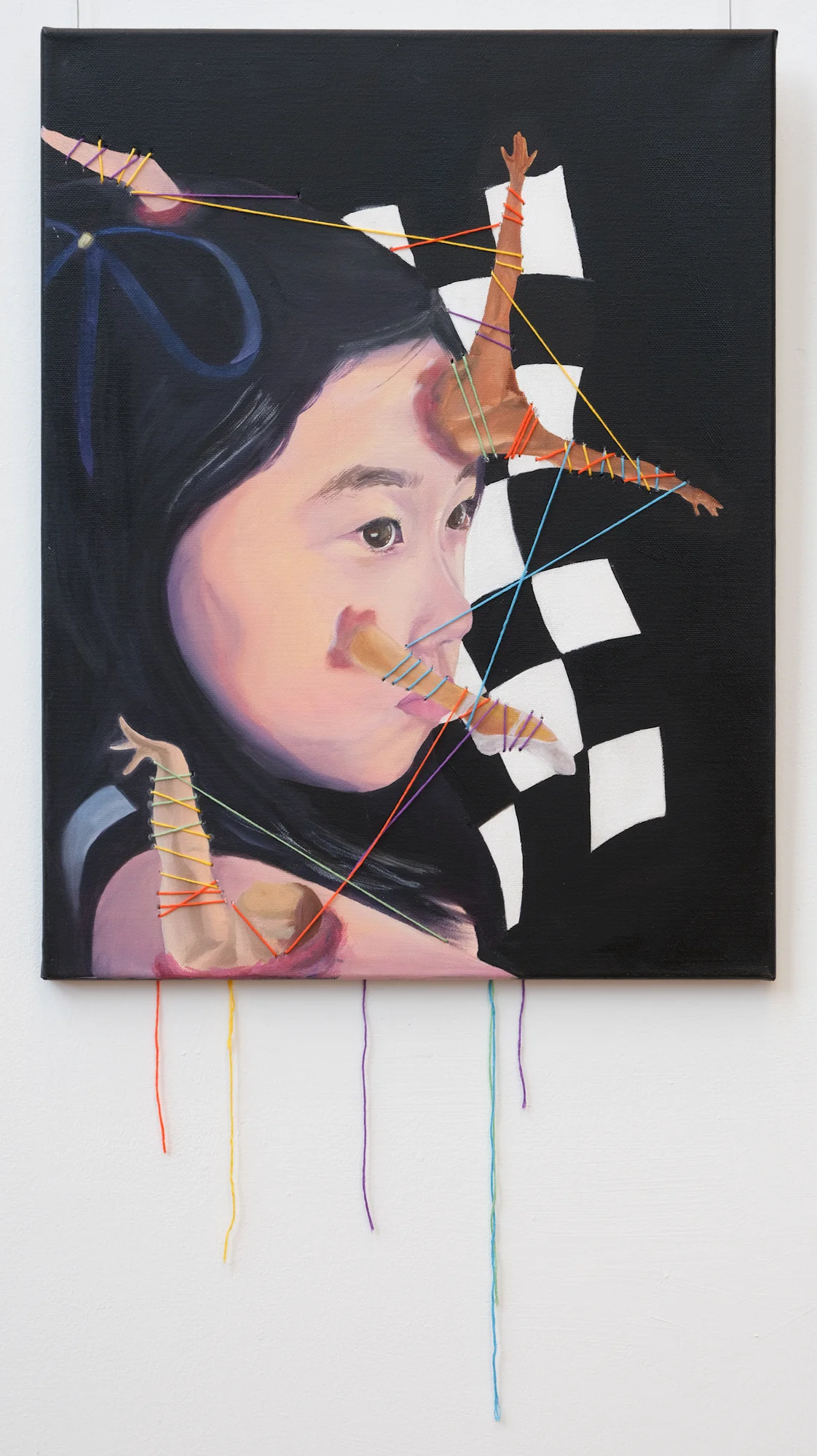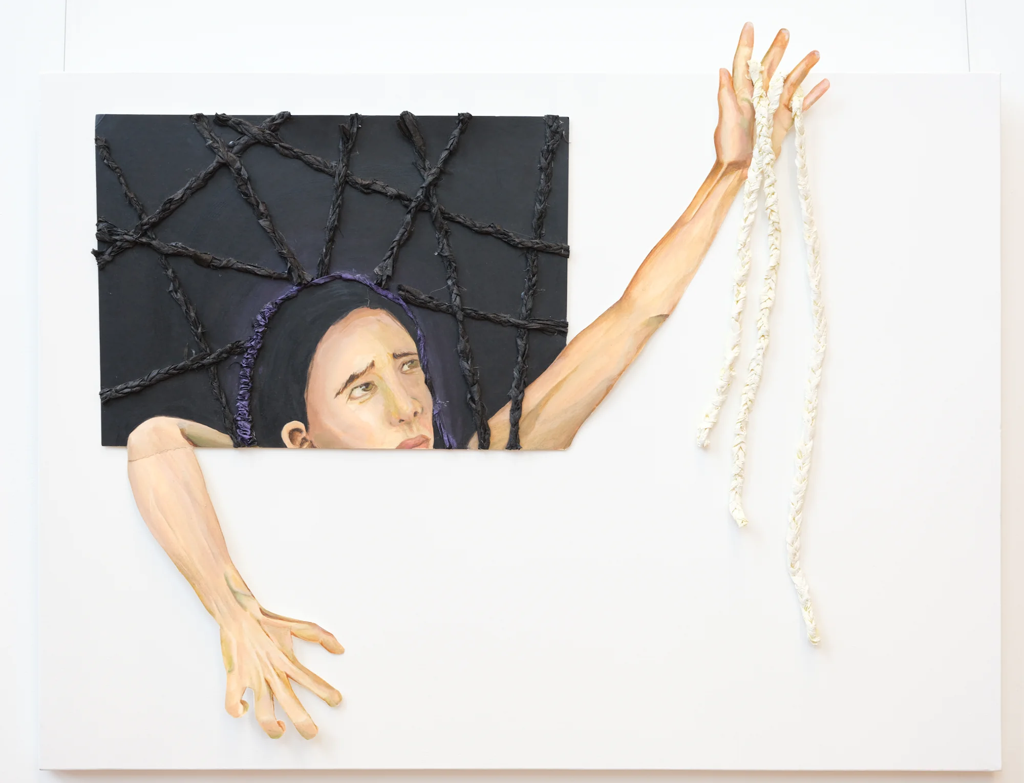 Modern society is parallel to the Panopticon, where individuals become the inspectors of one another, transforming themselves into what is acceptable in society. A figure’s desperate face reflects a desire to reverse the transformation that had taken place to overcome this societal structure. The entangled Hanji paper emphasises the constraints under society’s surveillance. Yet, the figure extending beyond the canvas symbolises breaking free from self-imposed pressure that transforms who I am.