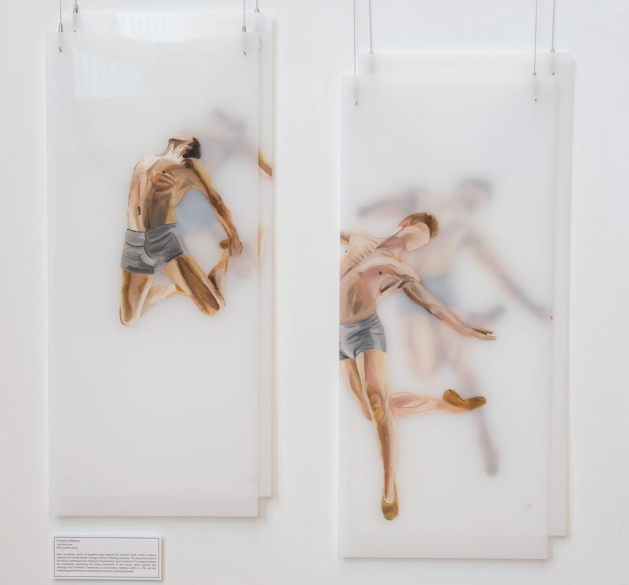 Each movement leaves no tangible traces beyond the moment itself. Echoes in Motion captures our transformation through a series of fleeting moments. The anonymous face of the dancer symbolises how fading and impermanent each moment is. Four opaque panels are overlapped, portraying the rising movements of the dancer, which signifies that although each moment is temporary, it accumulates resilience within us. The red line interacting with the dancer represents the timeline of personal growth.