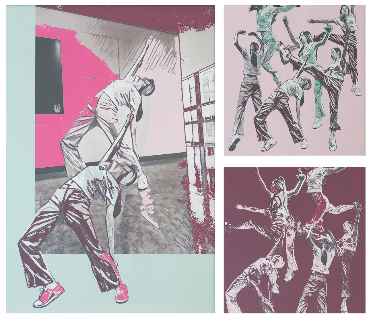 Transforming for the better requires a “glitch” – a sudden malfunction or irregularity. The pixelation represents the moments of disruption that lead to transformative growth. The random arrangement of the dancers emphasises the chaos of transformation, reflecting the unpredictability and turbulence one encounters in life. The contrast between grey and vibrant colours emphasises the duality between past and future, symbolising that they are in phase between different states of being.