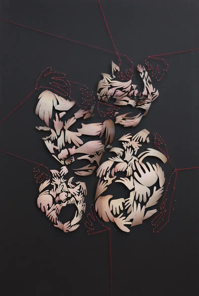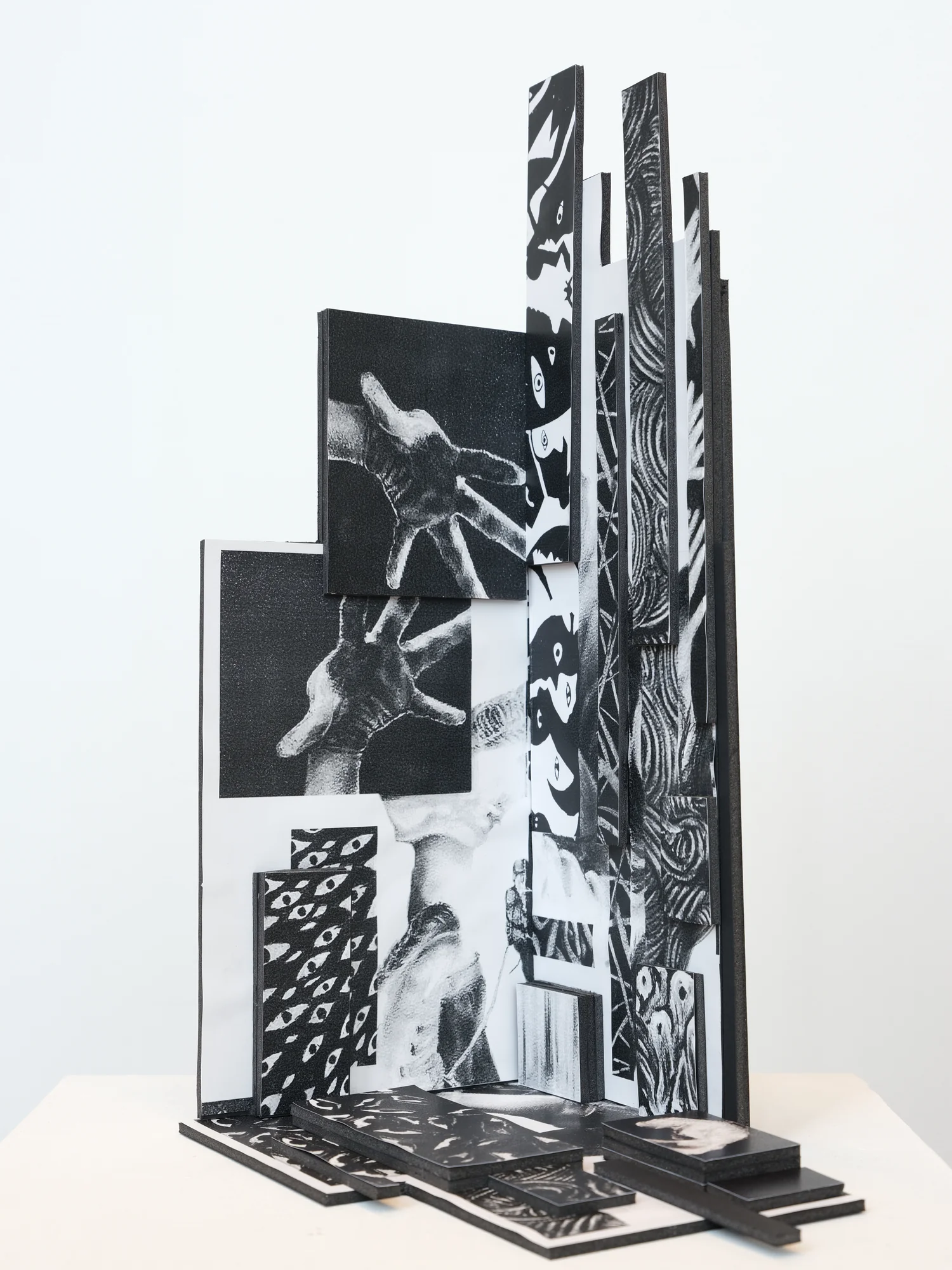 Fragmented aims to explore how our dreams at night provide a bare manifestation of our thoughts, stemming from daily experiences and beliefs. Hands hover above the void, serving as a mirror to our subconscious thoughts which remain unspoken, attempting to replicate reality through disjointed fragments. The screaming faces reflect my urge to project my thoughts which are trapped inside my mind. The black is symbolic of the darkness during nighttime and our deep unknown unconscious.