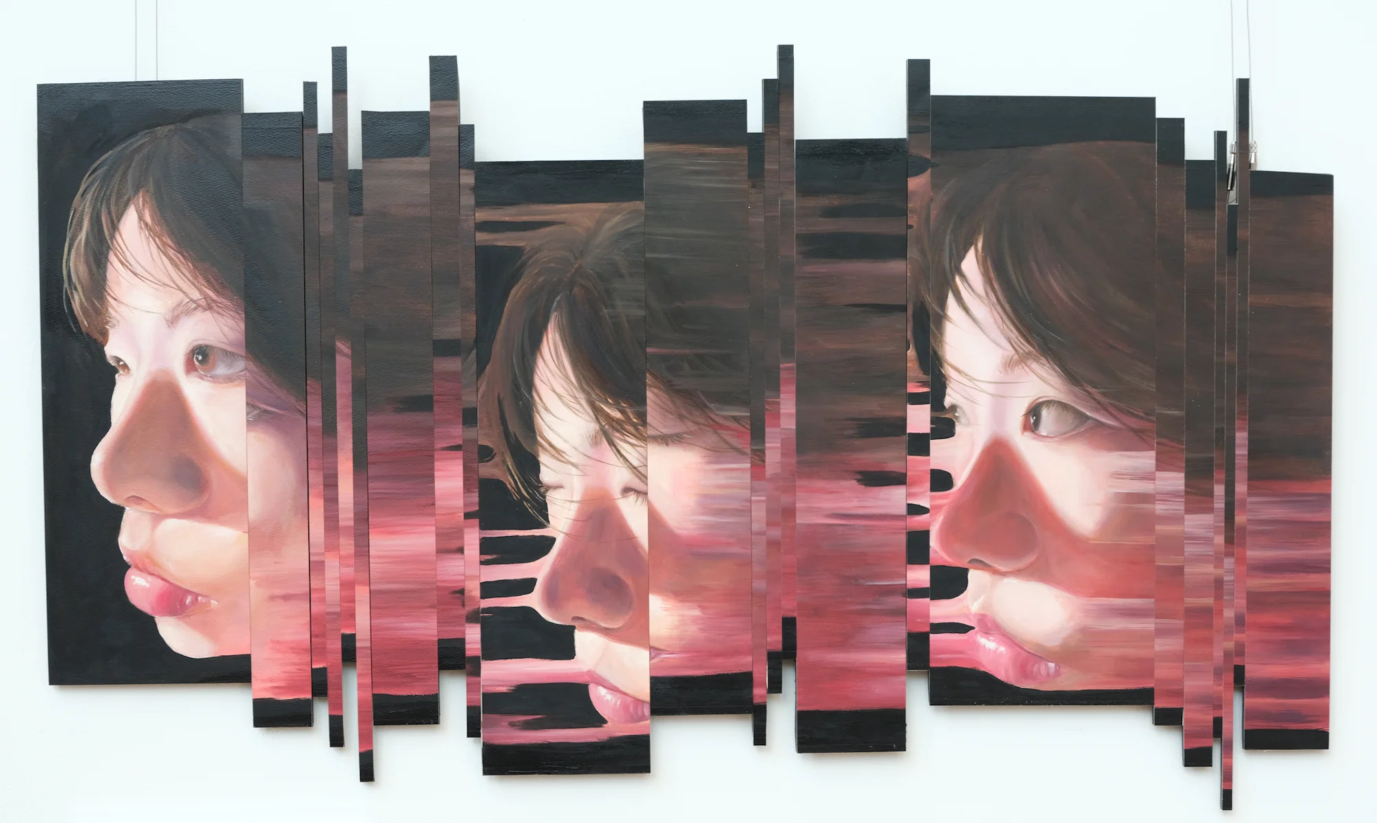Blink portrays the repetitiveness of having to wake up and confront the realities of our daily lives. This unpredictable nature of existence is signified by the narrow fractions of the face, reflecting the abrupt changes that can unfold after a single blink. The combination of closing and opening eyes signifies the passage of time, reminding viewers of the uncertainties we live through every day. The lines that extend from face to face reflect the inevitability of time elapsing.