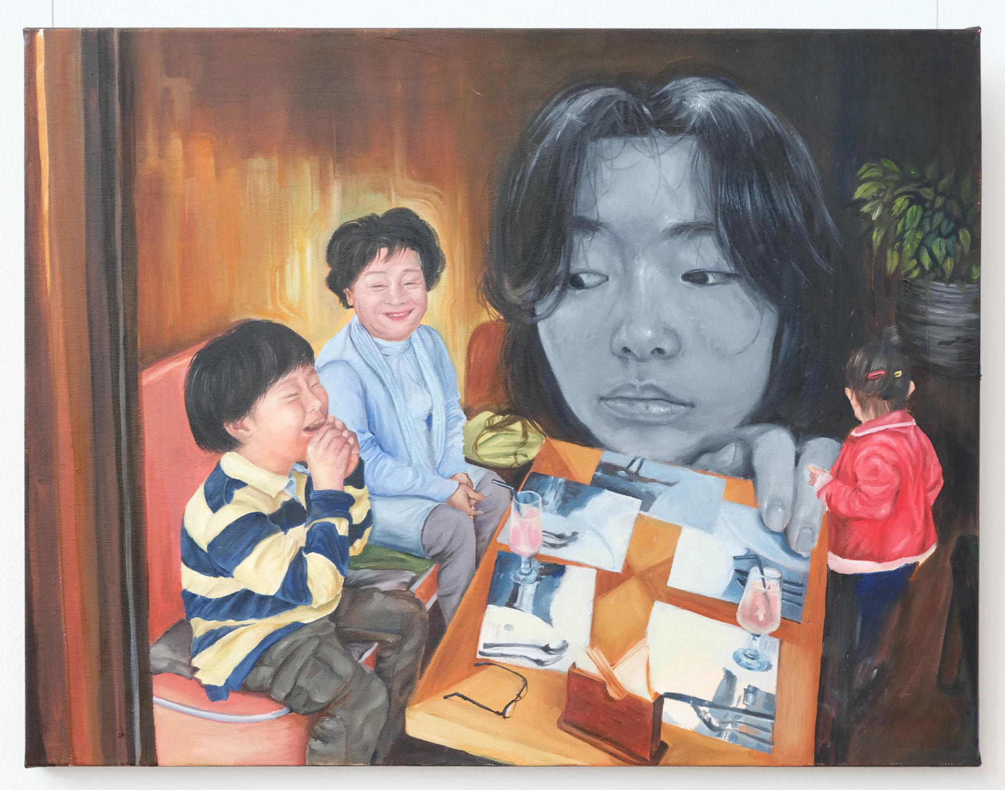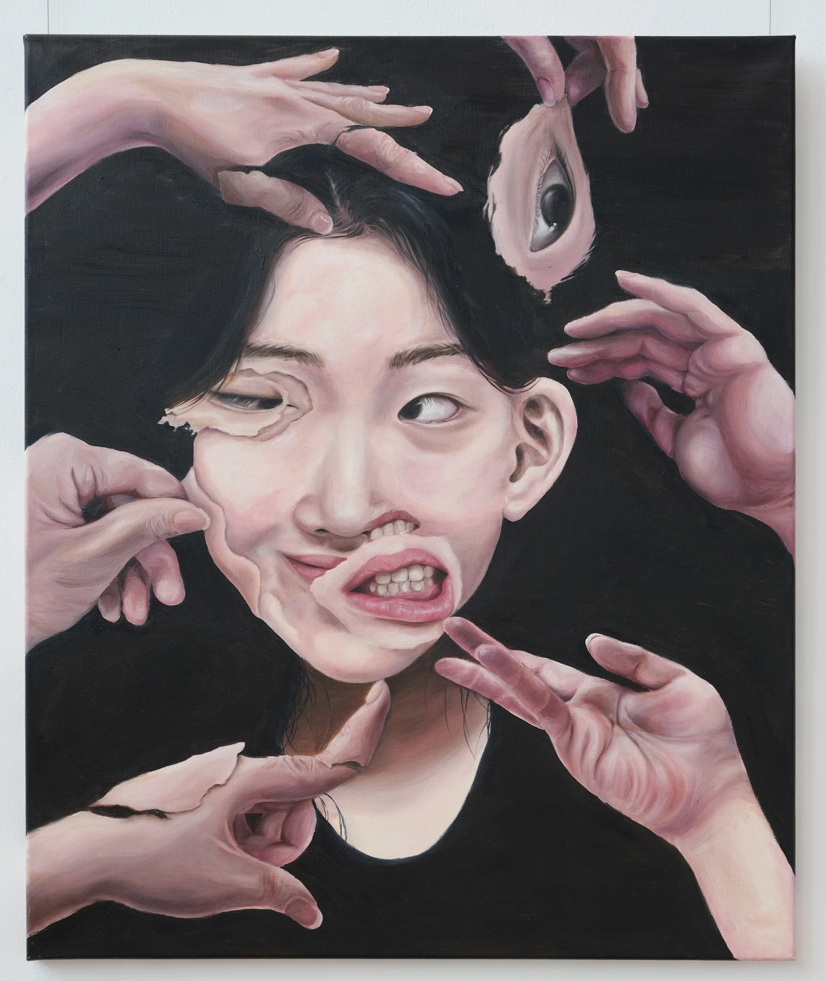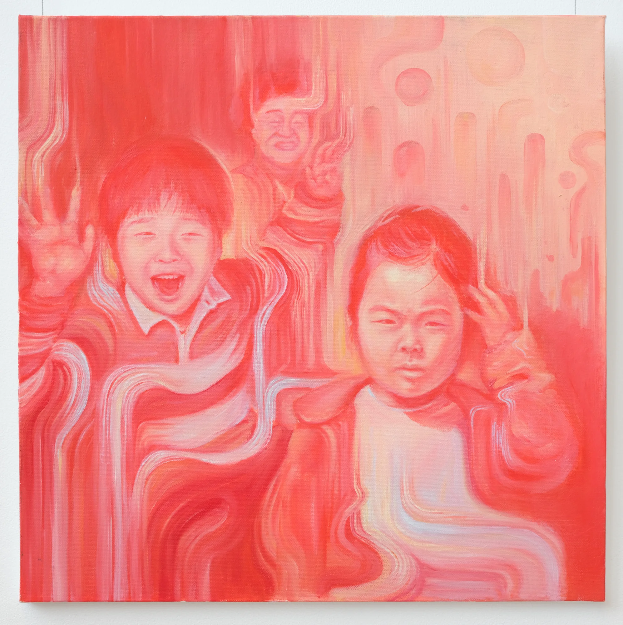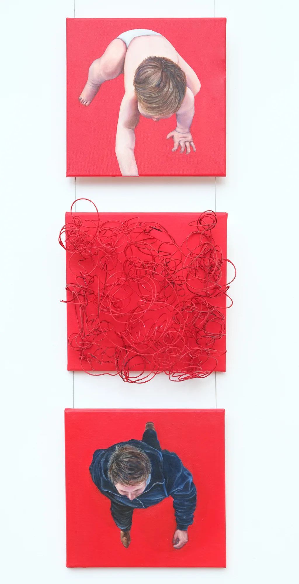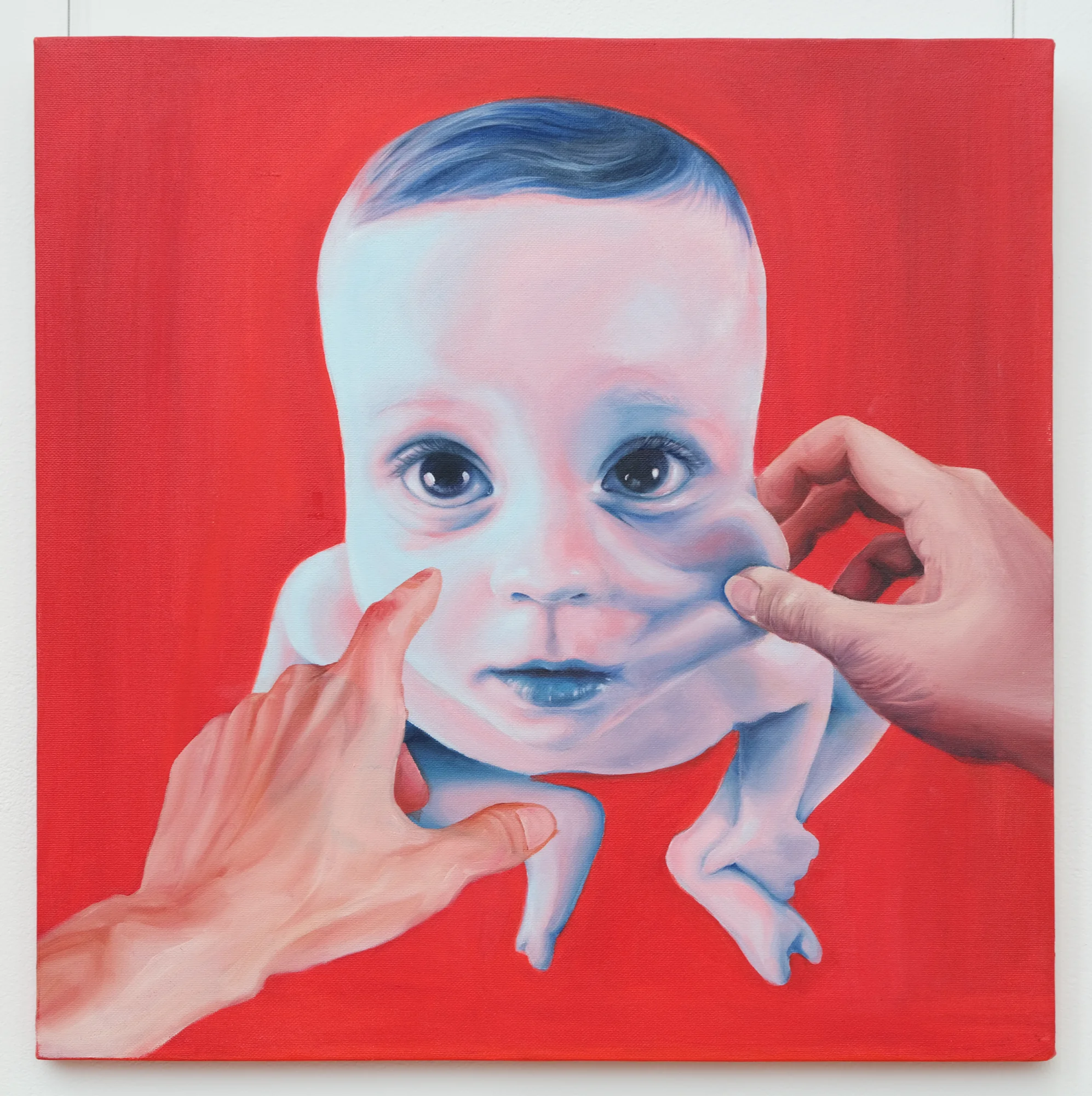 This painting explores the intertwined roles which mould a child's perception and reality. The adult’s hands touch the baby stretching its face, symbolic of the profound influence in shaping a child. The overhead first-person view allows viewers to confront the baby directly but also establishes their role in the power dynamic. The baby’s direct stare is disturbing and confrontational, questioning to what extent does our natural tendency project ourselves on others. Red signifies both power, love and discomfort.
