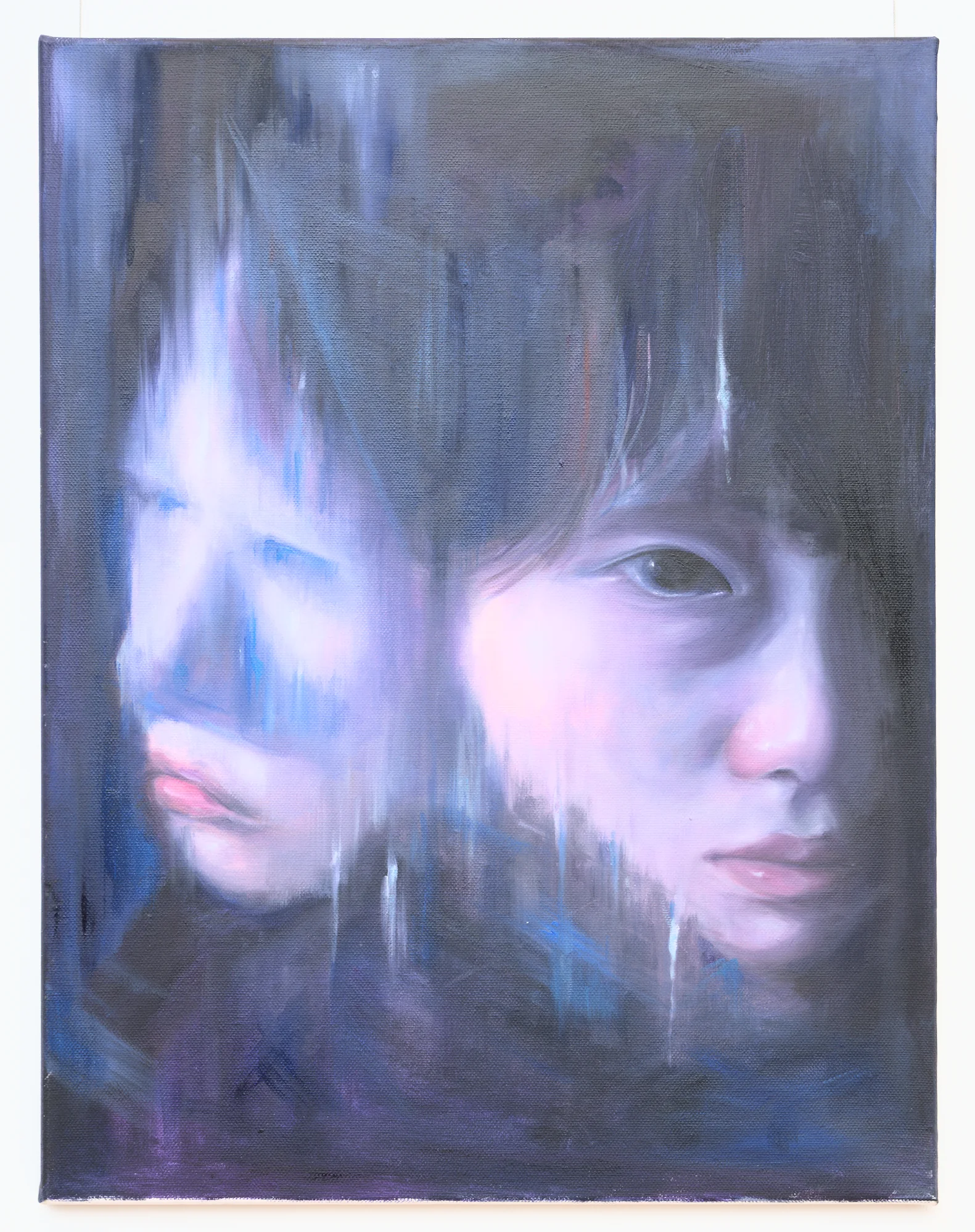 Duplicity offers an unsettling confrontation of the duplicitous facades inherent in most humans, signified through the two faces. The realistic face symbolises the mask we wear whilst the obscure face signifies the subtle nature of the duplicitous behaviour of individuals, which is not always clearly defined and unfathomable. The subtle blue and purple hues imply ambiguity whilst the shadowy background suggests our human tendency and inclination to hide aspects of ourselves.