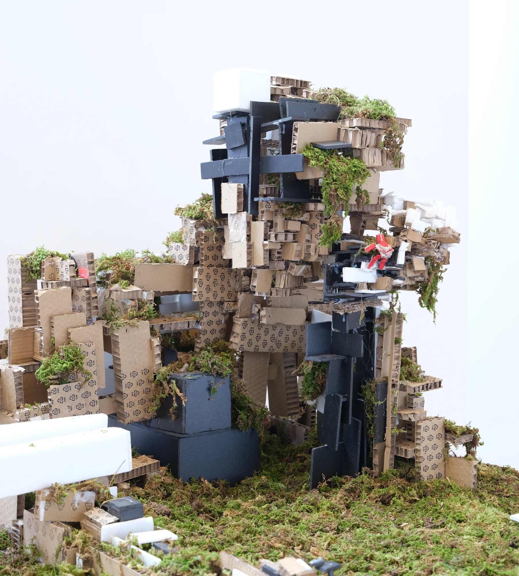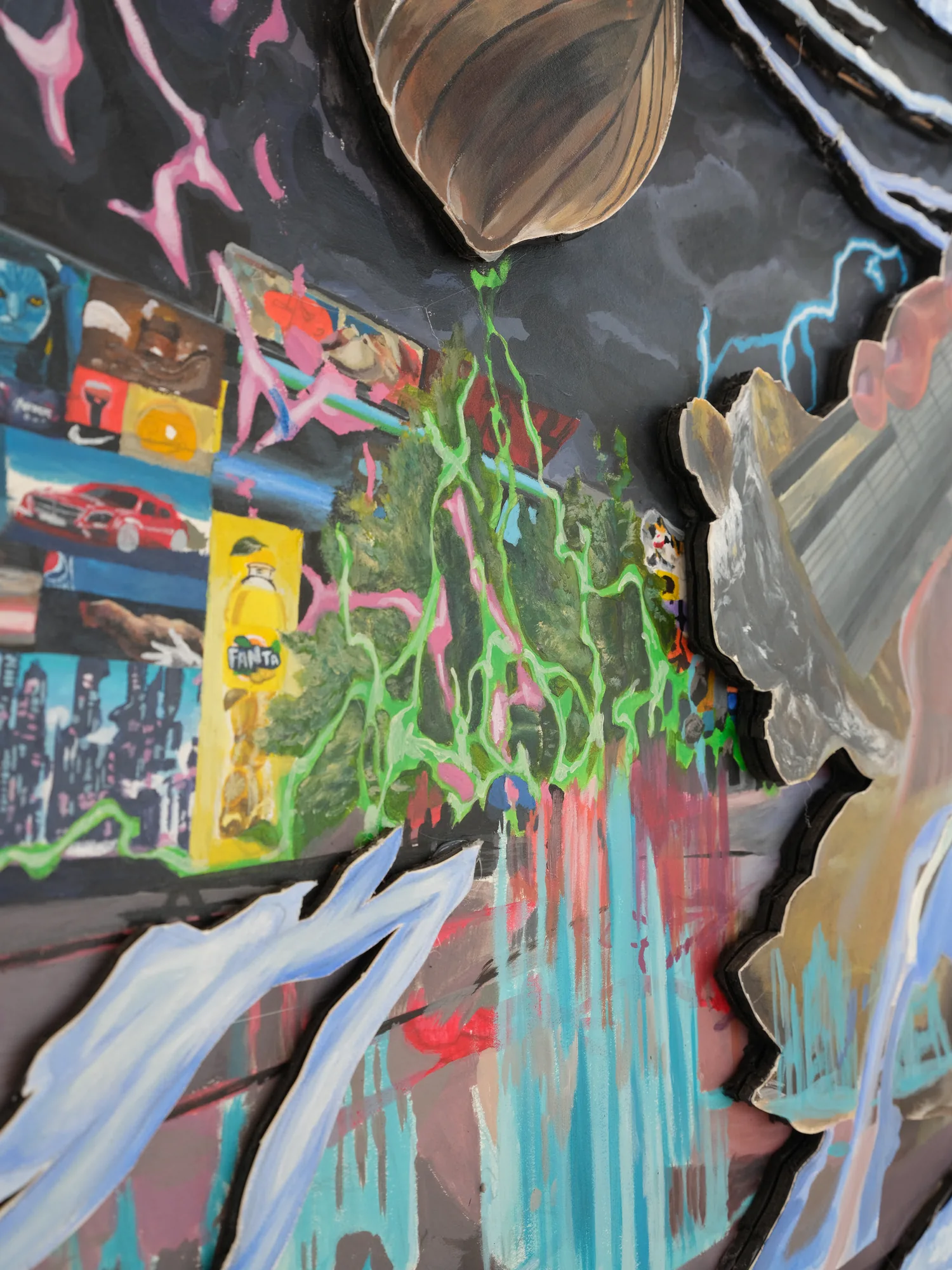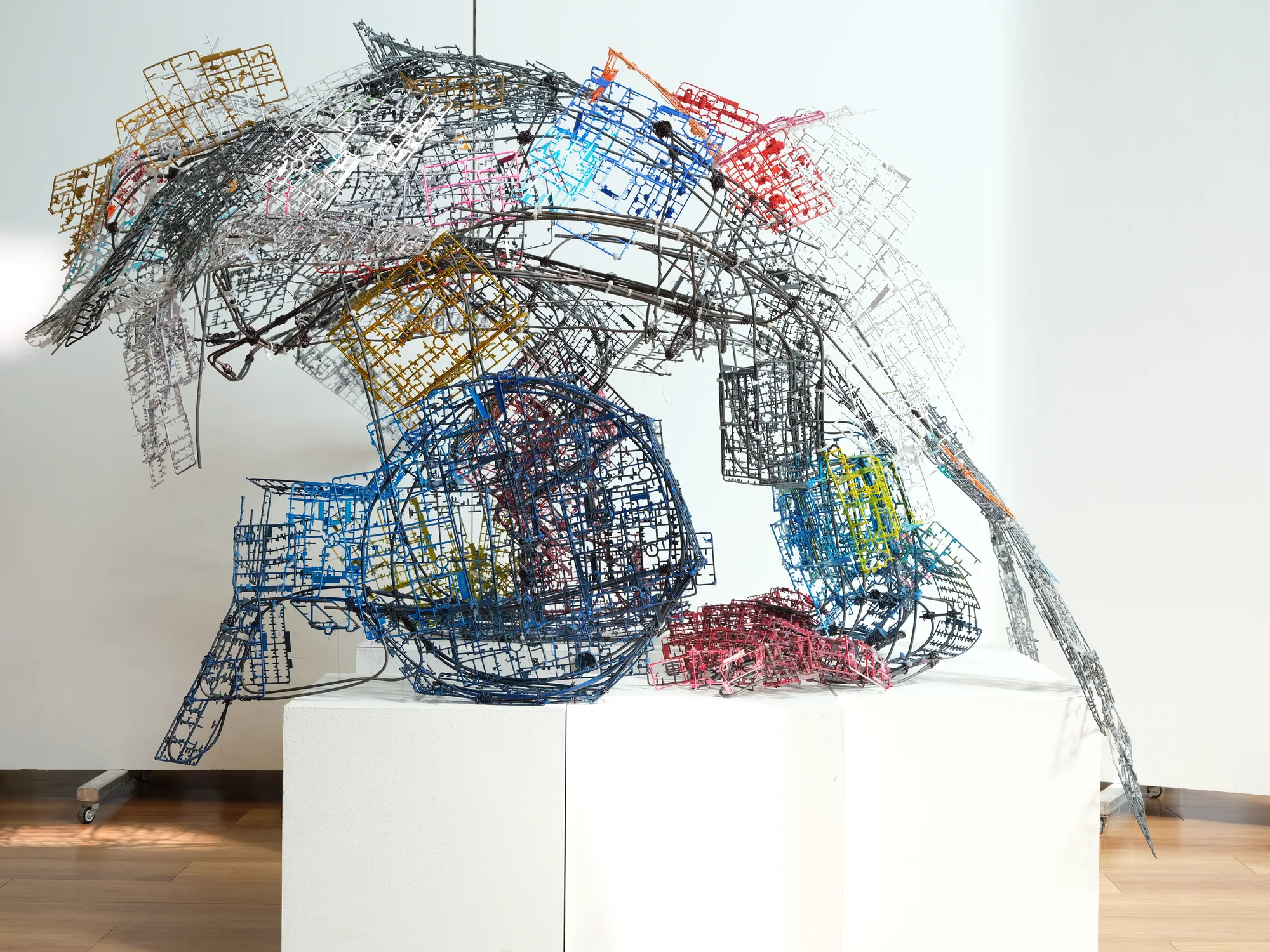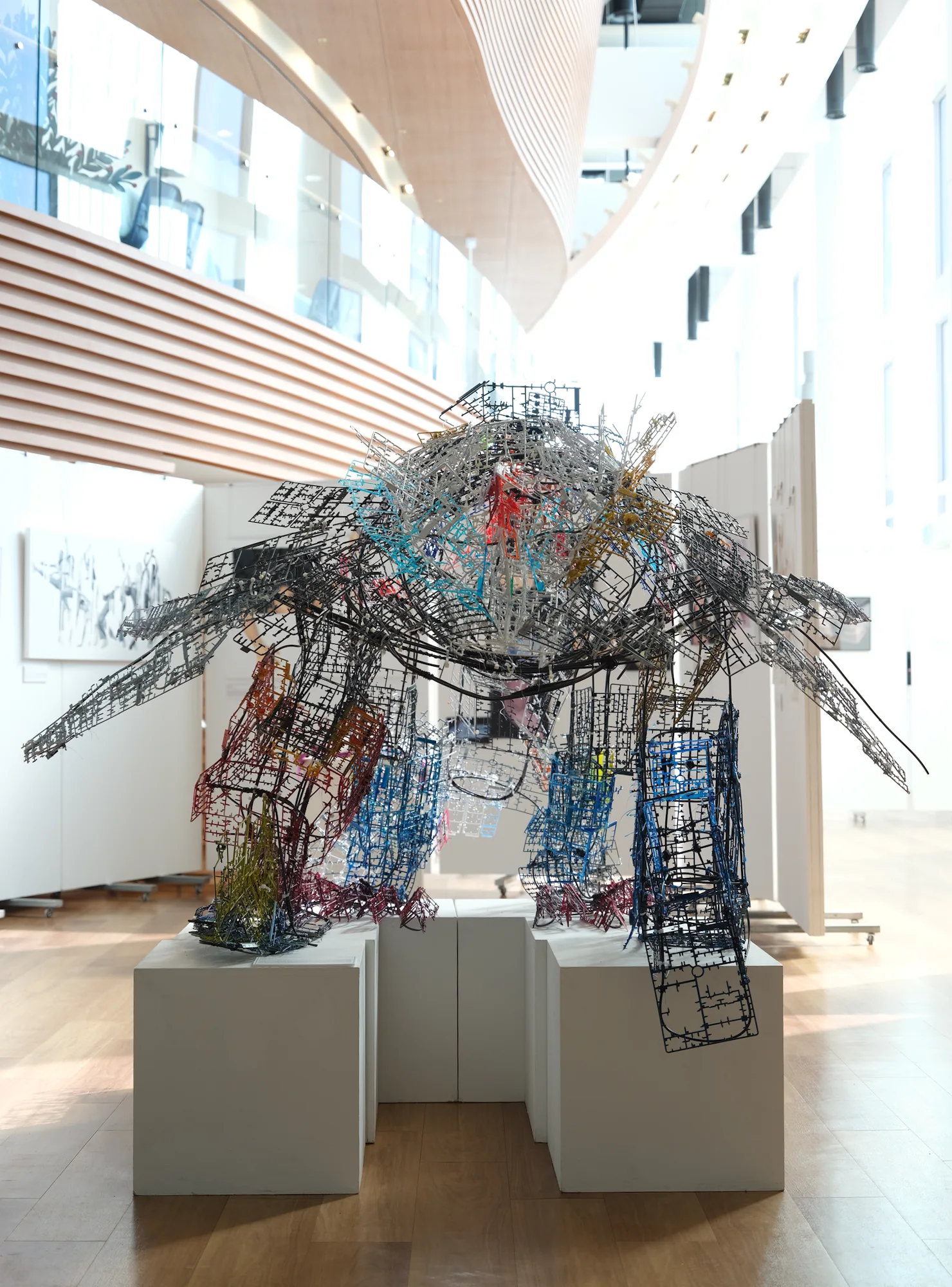 Through these scraps, I sought to build a purely organic creature like the amphibian animal axolotl. The white and saturated colours refer to the Japanese painter Murakami and act as an extension of his interpretation of “Oni”, a Japanese ogre. Using the characteristics that most of the paintings in the exhibition are modern, the saturated colours stand out, making the creature seem like an anomaly and a disaster in a peaceful exhibition, just as the “Oni” used to cause trouble in Japan.