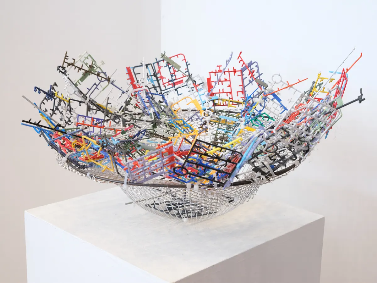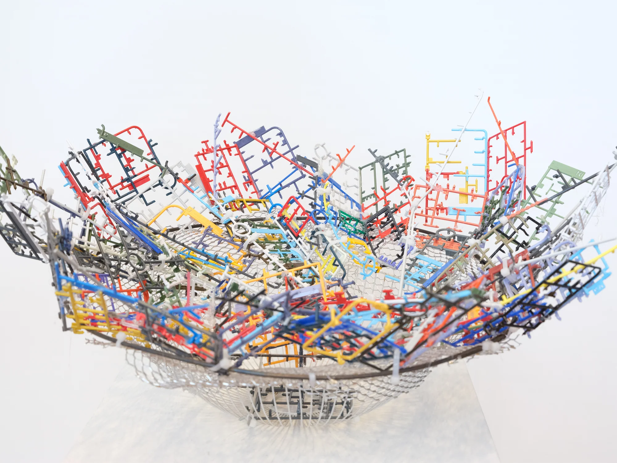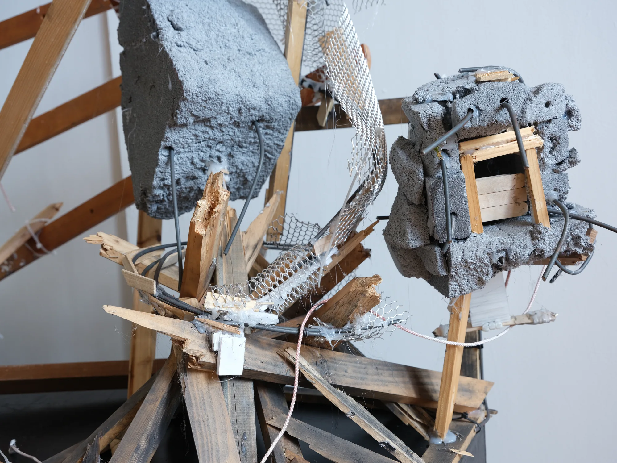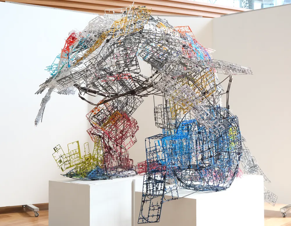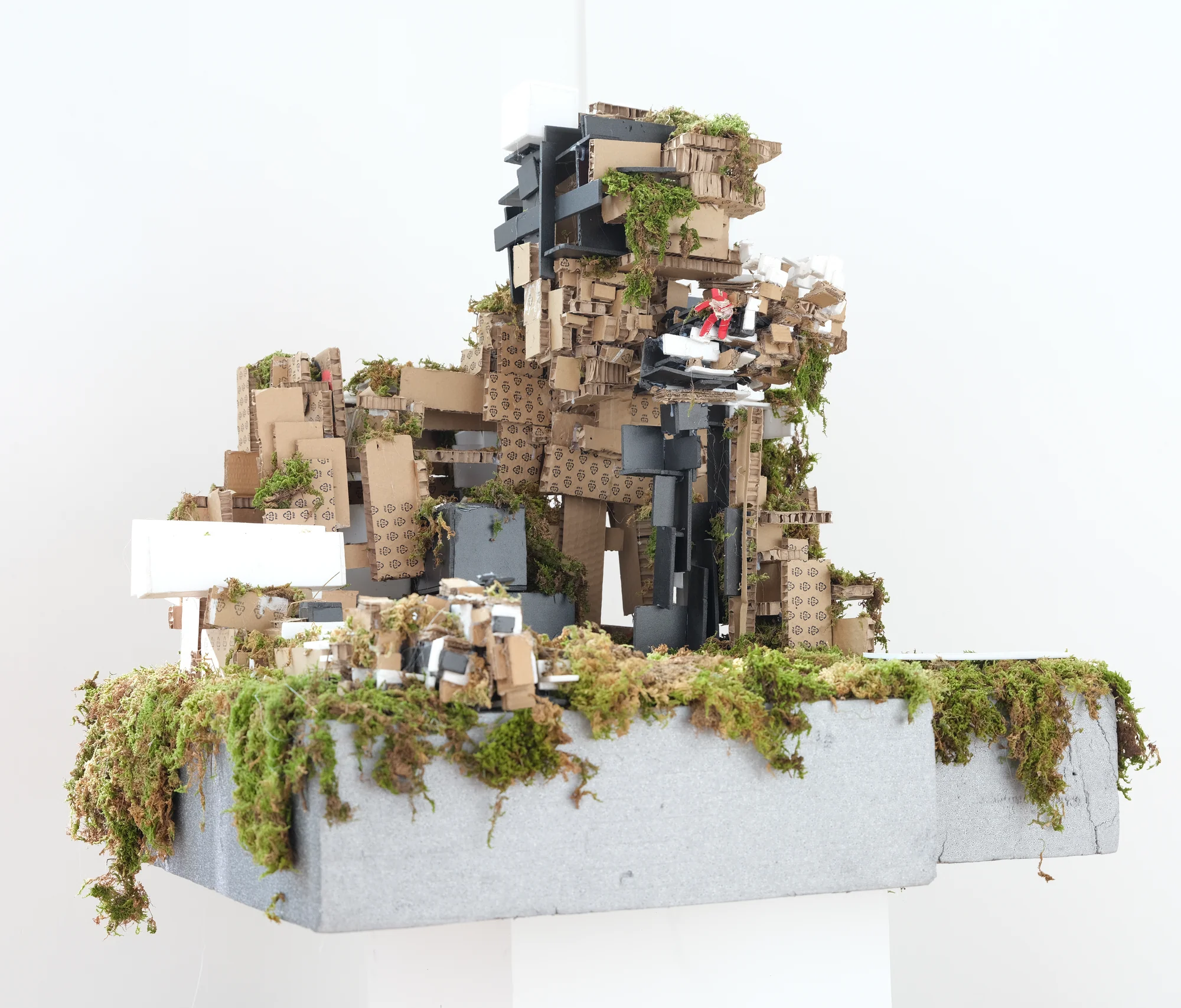 Through these scraps, I sought to build a purely organic creature like the amphibian animal axolotl. The white and saturated colours refer to the Japanese painter Murakami and act as an extension of his interpretation of “Oni”, a Japanese ogre. Using the characteristics that most of the paintings in the exhibition are modern, the saturated colours stand out, making the creature seem like an anomaly and a disaster in a peaceful exhibition, just as the “Oni” used to cause trouble in Japan.