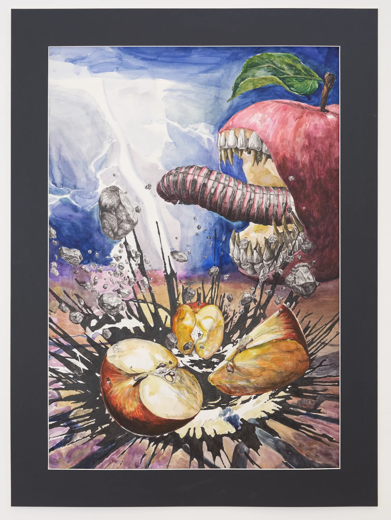 In today’s time, the significance of the apple has fallen to the ground with “Apple Inc.” overpricing their products. The painting aims to criticise this situation by putting a bitten apple on the back that has a disgusting mouth, portraying the dark reality that the company is “consuming the consumers”. The falling apple on the front refers to the first apple logo that refers to the founding of gravity, to illustrate that the once highly valued apples have come to a fall.