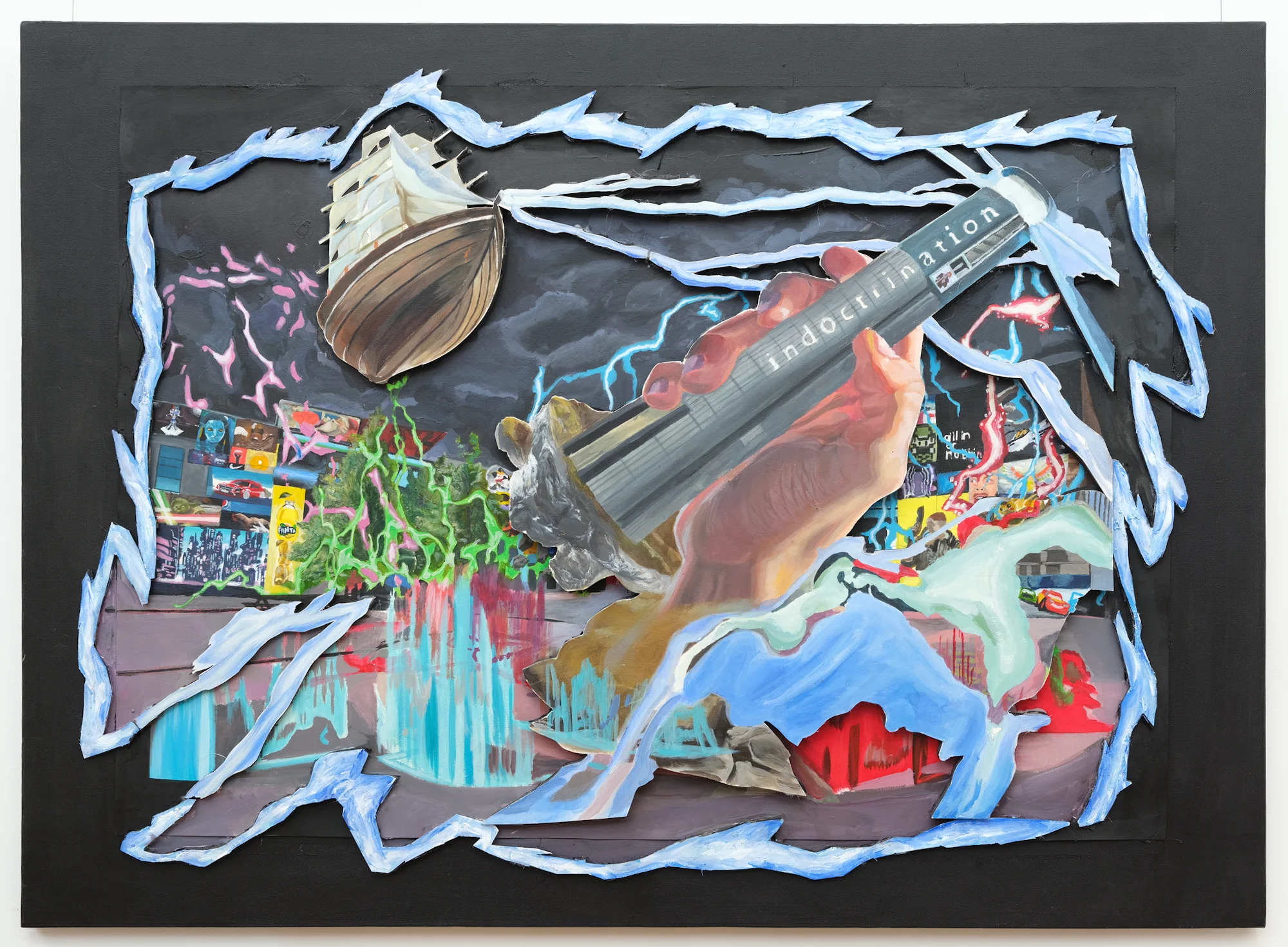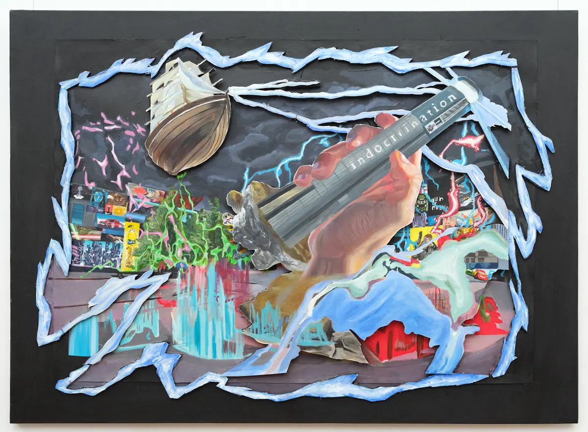 The artwork shows my praise to the school. The hand holding the tower is to add an idea of a student raising a hand. With the boat charging electricity onto the tower it lighting up, a visual interpretation of the school powering the “lightbulbs” in the student’s heads. BING! The videos in the background represent the “phenomenal” possibilities that the students can make in the future. The man in the tower represents the dance of joy due to the life lessons learnt at school.