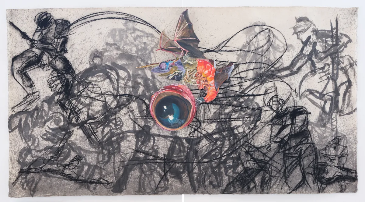 I wanted to express the very physical act of a moment in certain hobbies that I could not explore in my life yet. Fishing, cave-exploring, and having a dog are the top three hobbies I would like to explore. I utilised charcoal to depict the various acts of physical movement with broad, and vigorous strokes to capture the energy. Moreover, among the movement, I created a creature of my imagination that encapsulated these very moments.