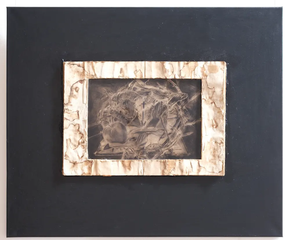 The overall aim of Art is to tell a story. I aimed a bit further to take this message into a literal meaning and make my artwork into an entrance to my story. The book frame is a reference to the common cliche of one being sucked into a book and another world. The goat, book, snake, apple and thorn crown are all references to the bible, the oldest story known to humanity. These elements give signs that the reader is being sucked into a bible, the record of humanity and God.