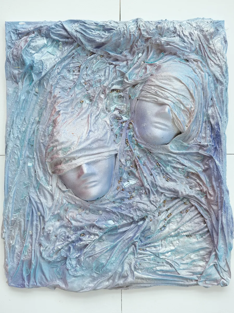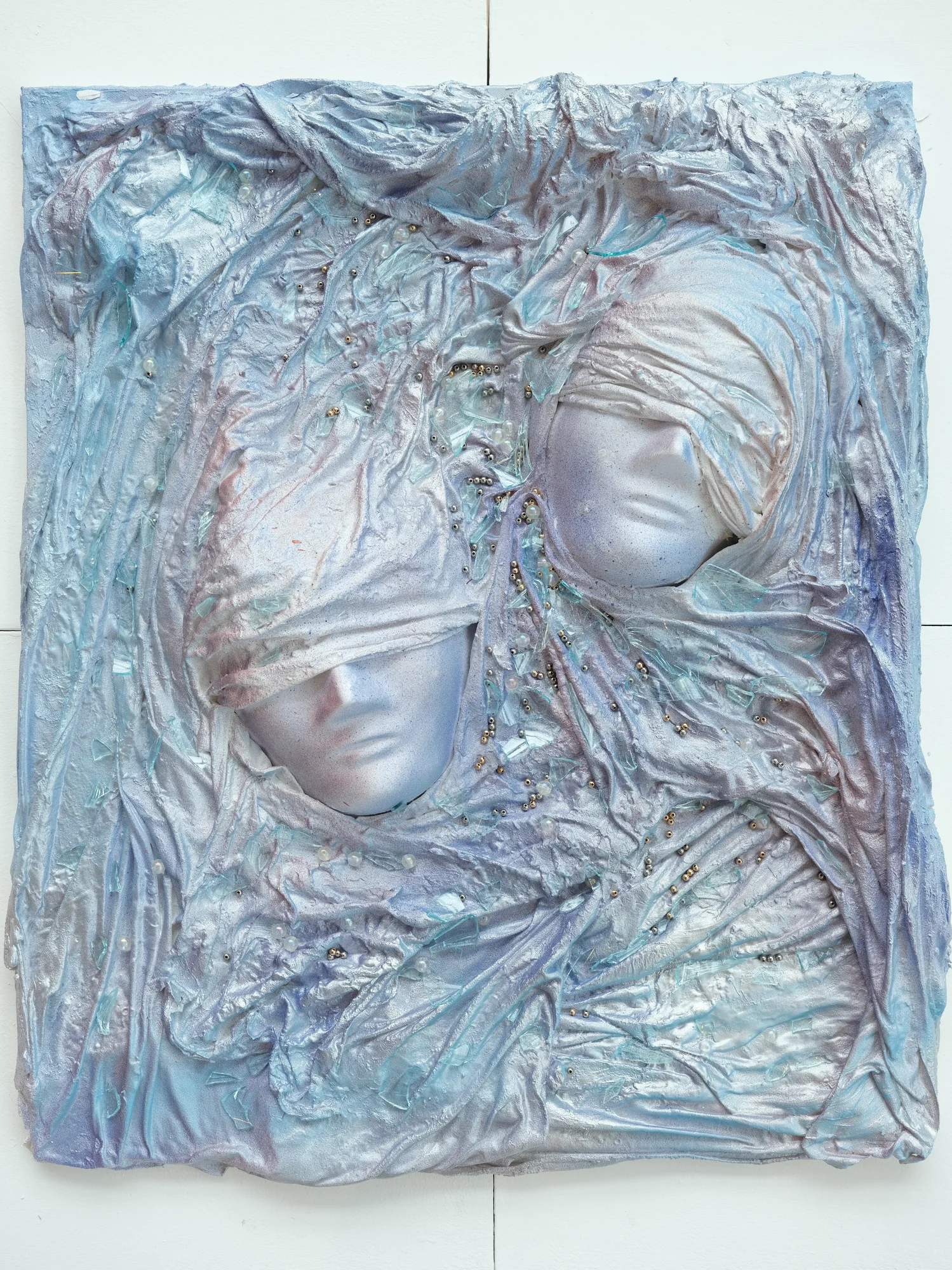 Veiled Identities presents two masks on canvas, their eyes obscured by dense layers of blue and purple cloth. Encased further by shards of shattered glass and scattered metal spheres, the composition evokes a sense of entrapment. Through these elements, the piece explores the theme of Spiritual blindness and Protection - questioning whether concealment serves as a shield or a prison.