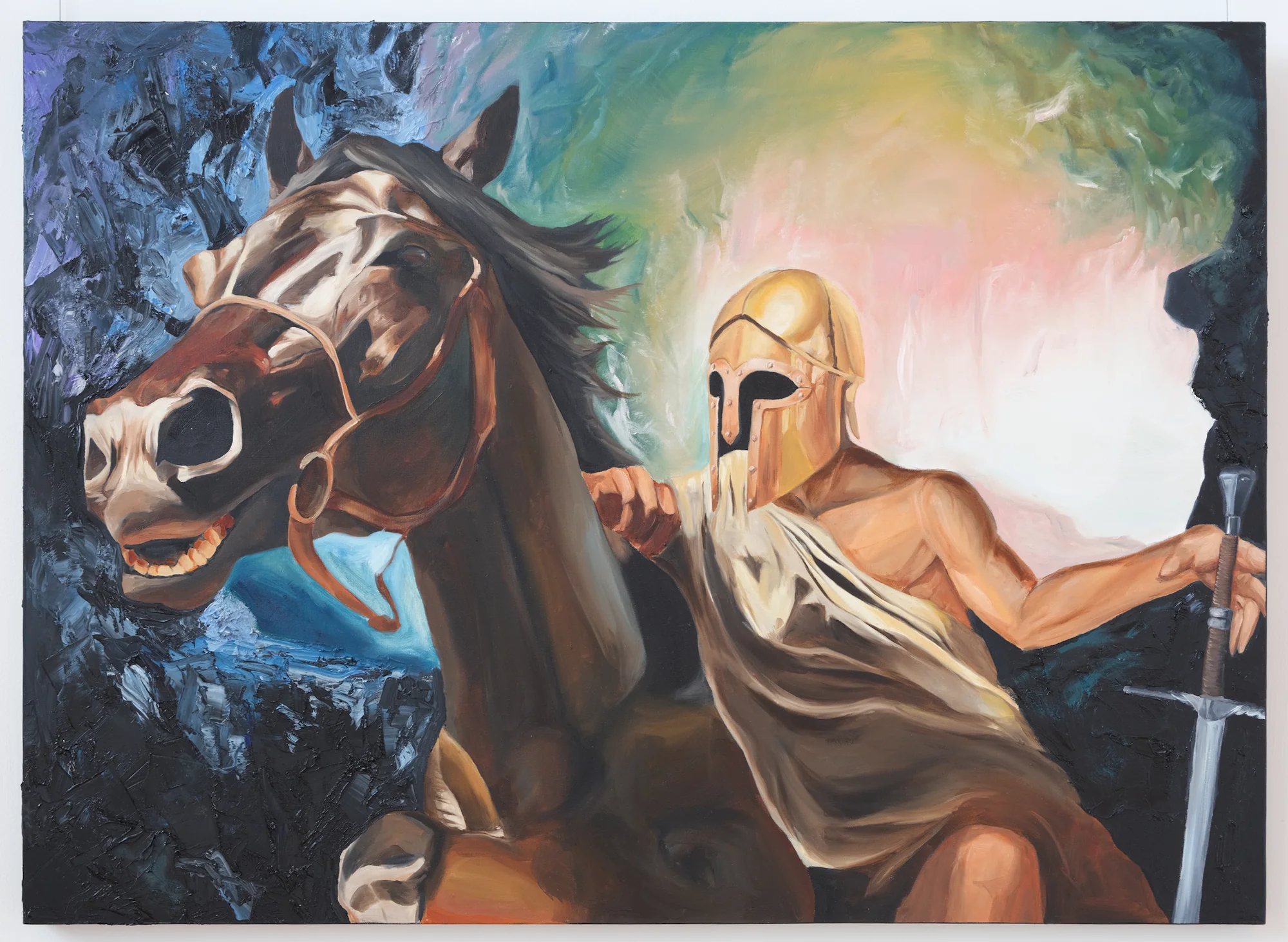 Path of the Unbound depicts a soldier in a golden helmet wielding a sword, symbolising rebellion against social norms, and the boundaries of life and death. Inspired by the Biblical ‘Narrow Gate’, the transition of the background colour tones signifies the soldier heading into the darkness, rejecting a predetermined path in human lives. The horse represents strength and freedom, mirroring the pursuit of individuality, urging viewers to question conformity and seek their own truths.