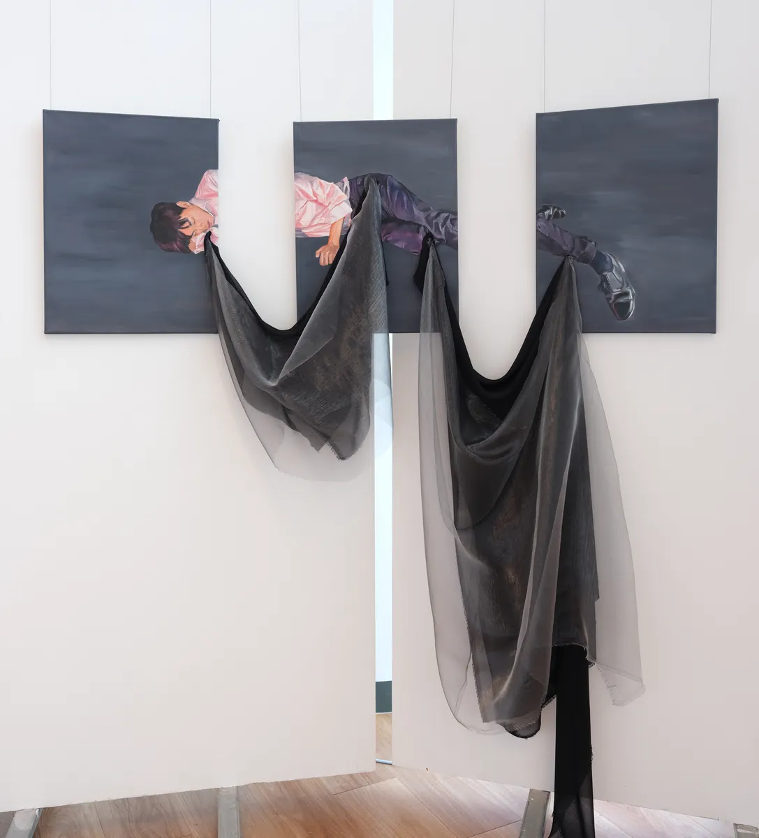 Threads of Destiny aims to showcase the fragmented nature of humans’ fates. The composition of three canvases evokes the presence of the three Fates of Greek mythology - Clotho, Lachesis, and Atropos - who spin, measure, and cut the thread of life. The cloth serves as a symbolic thread, reinforcing themes of mortality and the inescapability of fate. The monotone background signifies the absence of time and space, hinting that the figure is abandoned in limbo.