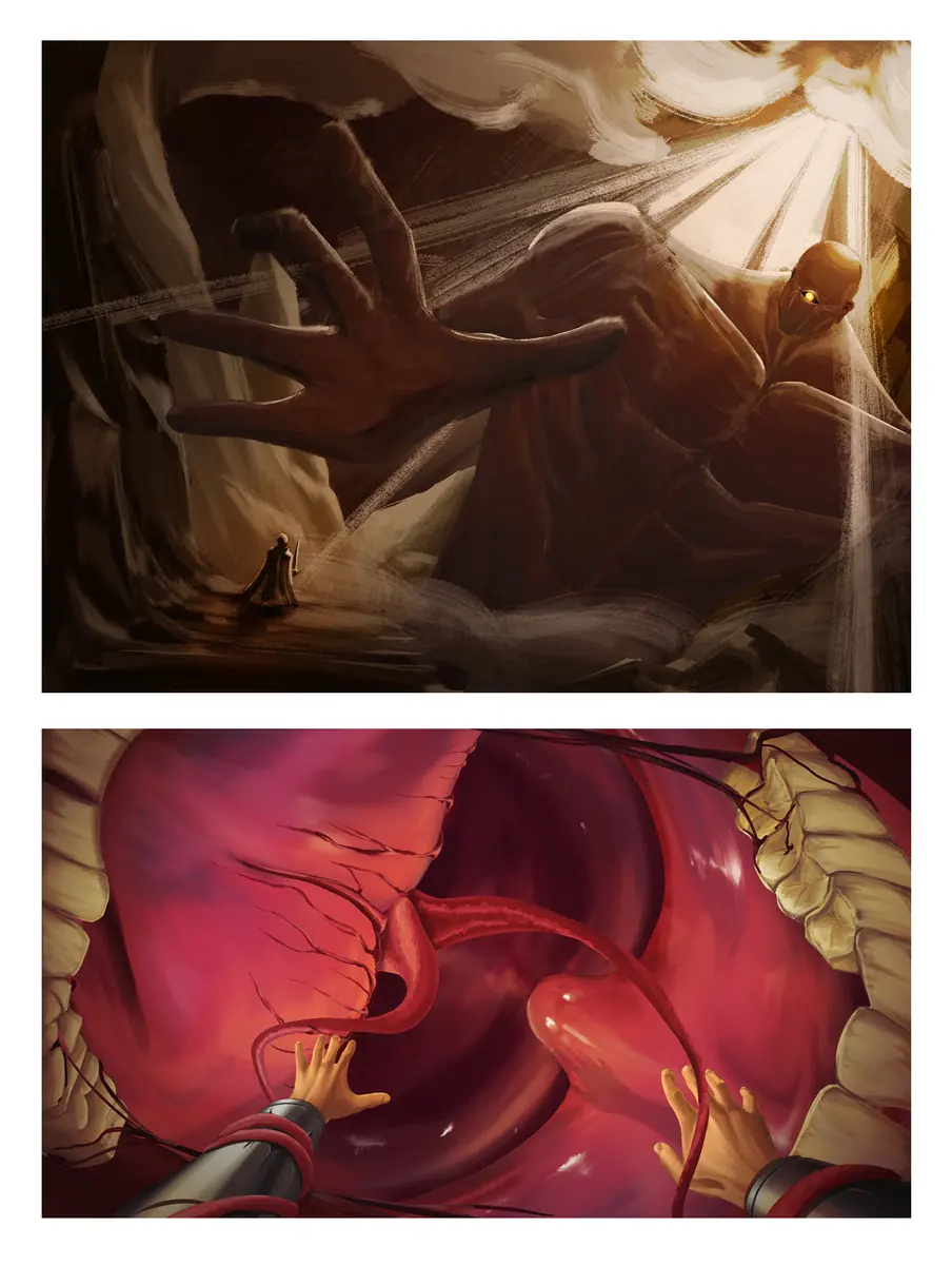 You Fool! expresses the expectations and reality upon facing godly entities - tenacious forces. The paintings contrast human hopes with divine reality. The size disparity in the first painting highlights mortal insignificance. The second work's reaching gesture shows futility against cosmic powers. Here, light symbolises divinity; the knight's darkness represents powerlessness. This contrast emphasises the mortal-divine gap, shattering human illusions when facing celestial might.