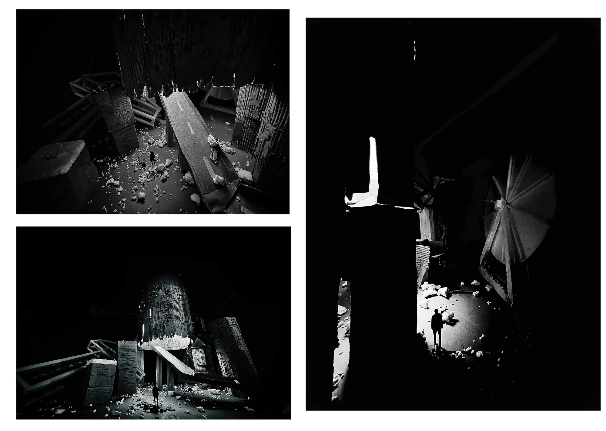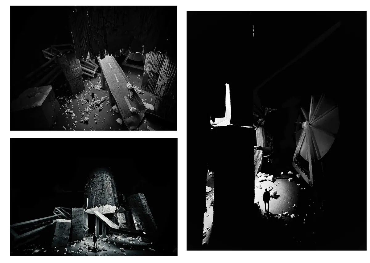 This work is a vision of an apocalyptic city in a world that has been worn by corrosion, in which air, space, and human vision bend to ecological failure. The destroyed buildings speak to human hubris but within the wreckage, there is potential to rebuild. The shadows and shattered forms testify to despair, but something new can be forged from the wreckage. The play of light and texture is a haunted one that raises questions and symbolises humanity's hand in making its own destiny.