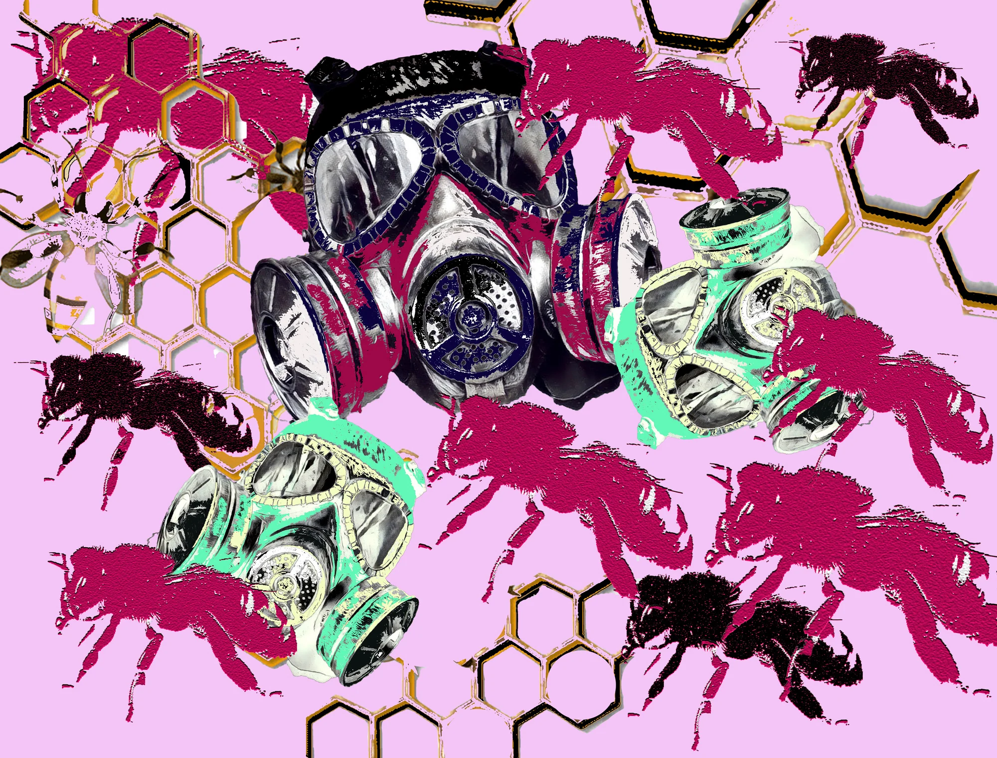 This work was created by photoshopping a honeycomb, a mask, and bees together. The bees are black and red. Black symbolises death, and red symbolises a warning to the Earth. The mask and honeycombs are black to show the trees and people dying from global warming. Lastly, the background, which takes up the largest portion, is in pink to symbolise innovation and change.