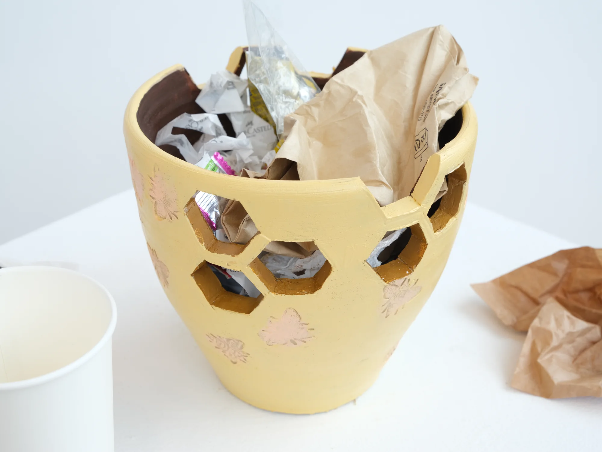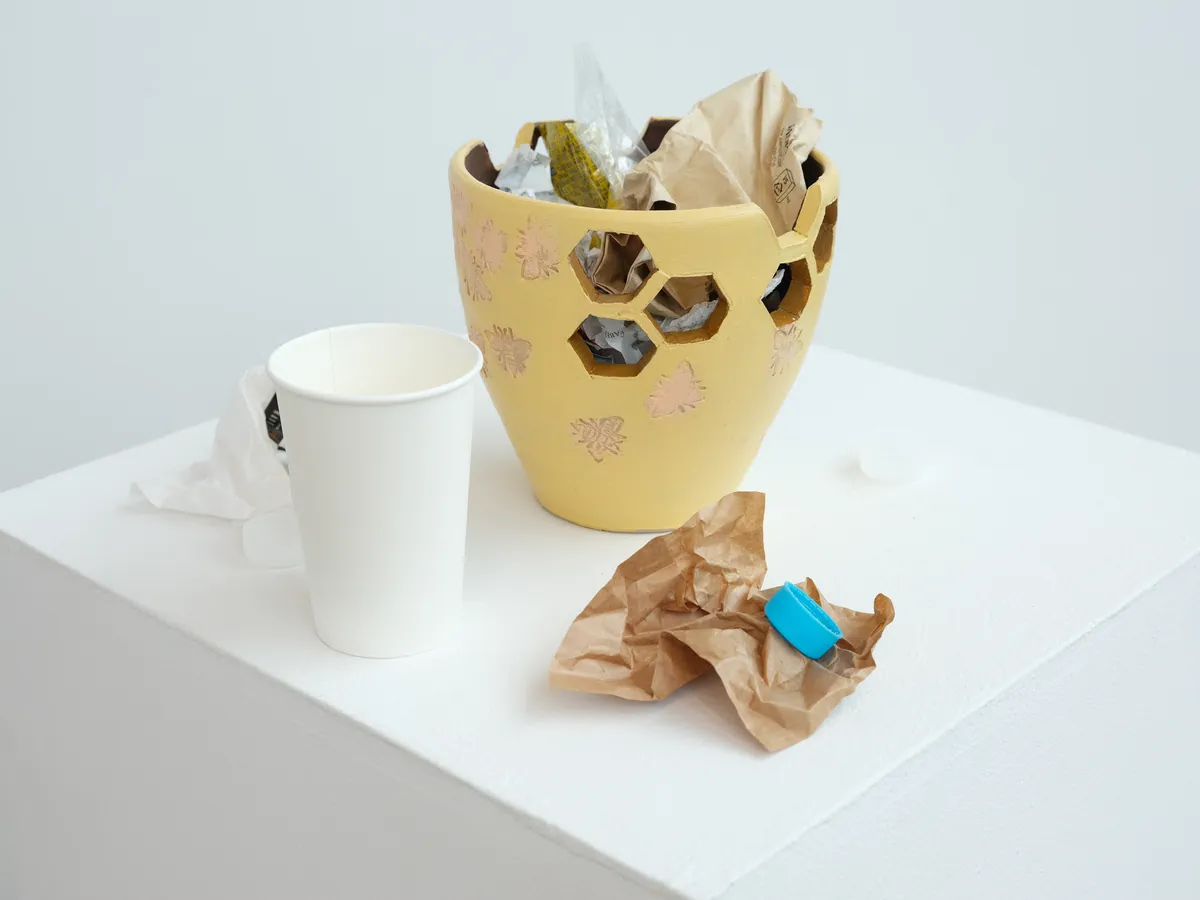 The ceramic pot symbolises both the trash bin that we often see in our world and a bee hive, I juxtaposed the symbols to bring attention to the fact that we need to be aware that what we throw away has a direct impact on the environment that surrounds us.