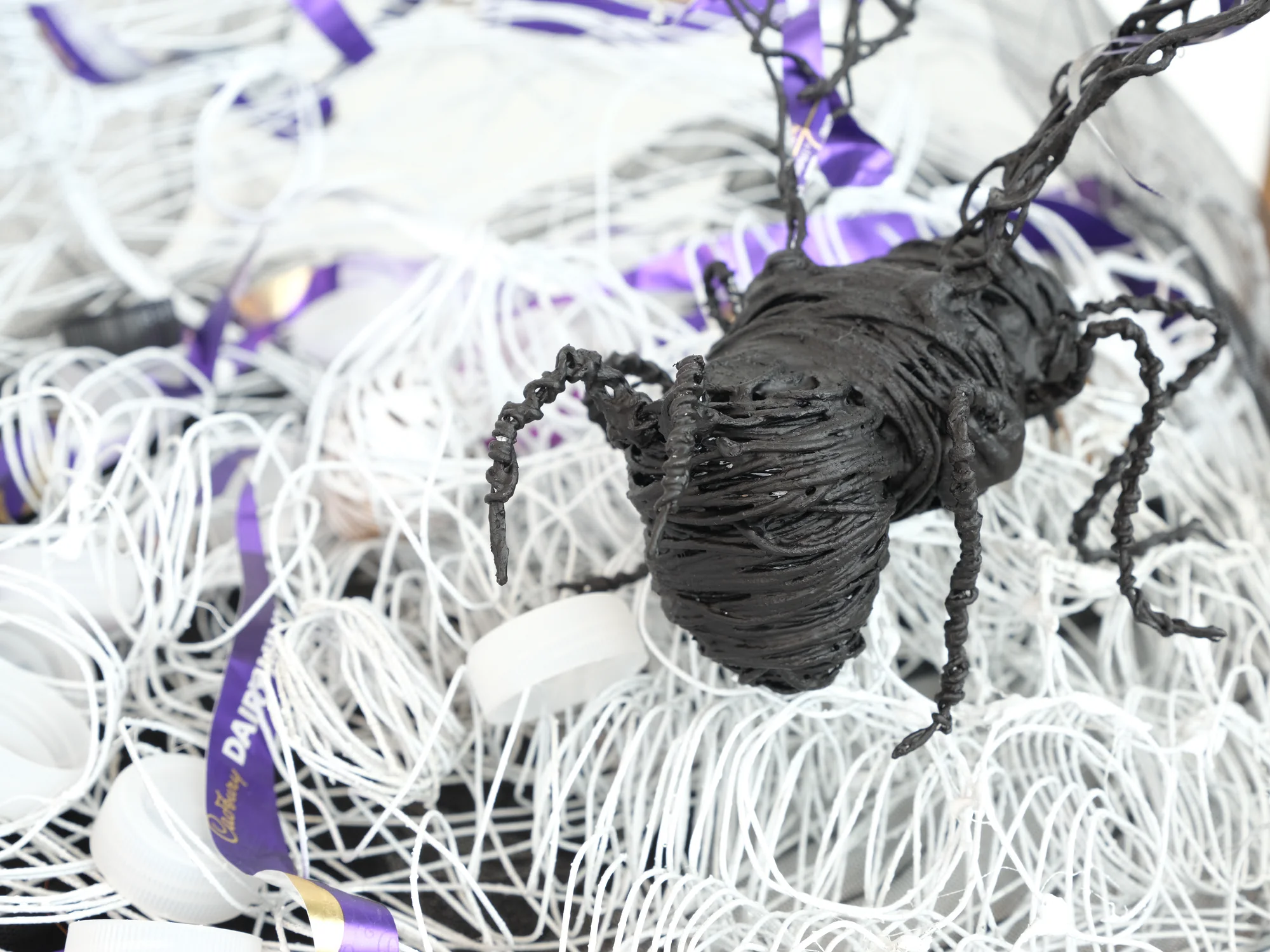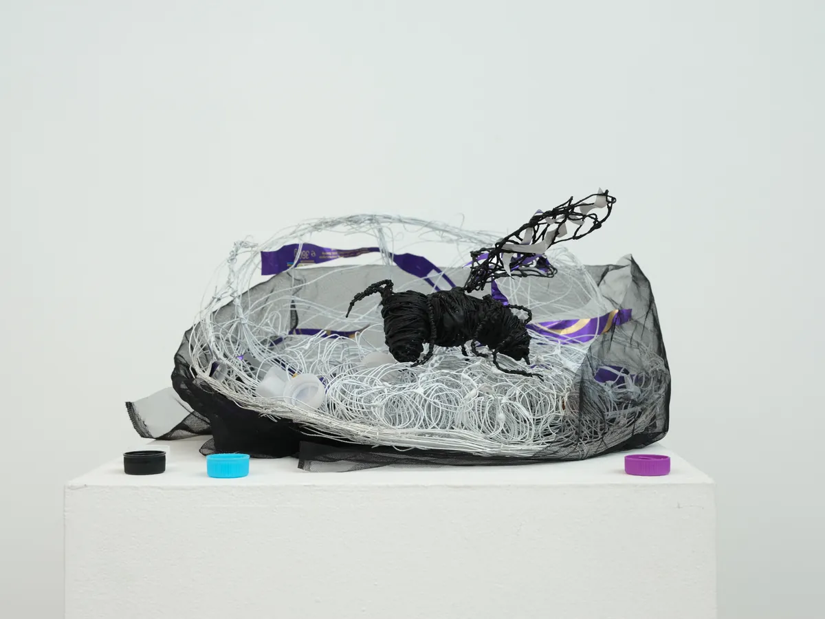 This sculpture despite a queen bee in her ruined hive. Black represents death, and white symbolises a subtle ray of hope. The bees have been dying at a very high rate in recent years and this is largely due to climate instability caused by global warming. One of the primary reasons for global warming is the excessive use of plastic. I wrapped the queen bee wings and the beehive in plastic and filled it with plastic bottle tops, showing that the trash is limiting her from running her hive properly.