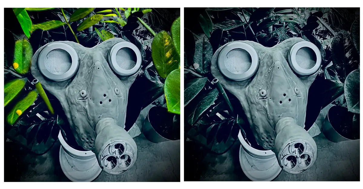 This work is a reflection of the need for masks throughout time, from smog crises during the beginning of the 20th century to current air pollution issues. The gas mask, having been a symbol of survival in the past, is now a symbol of worsening air quality caused by global warming today. The hard, metal details of it recall a dystopian era when breathing clean air is a luxury. Dark colours and the use of recyclable material underscore ecological deterioration. The ambient details of the green plant at the back symbolise the loss of natural habitats to industrial processes.