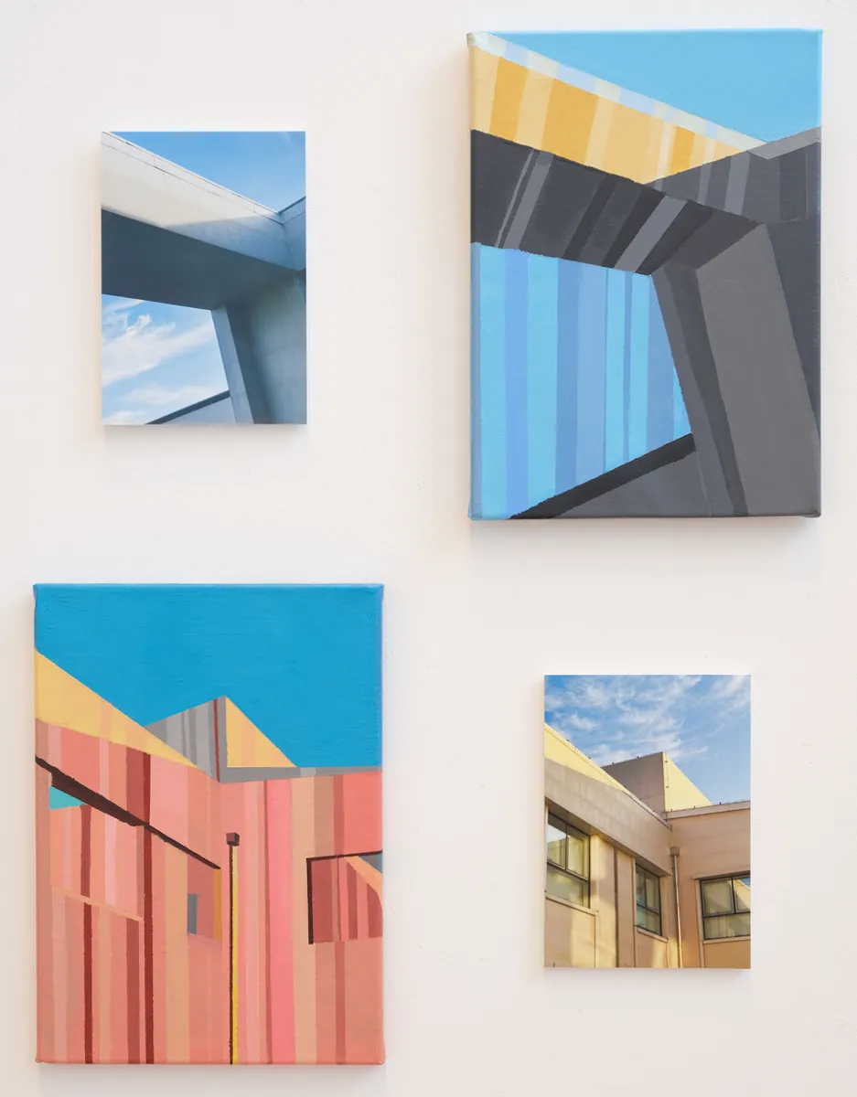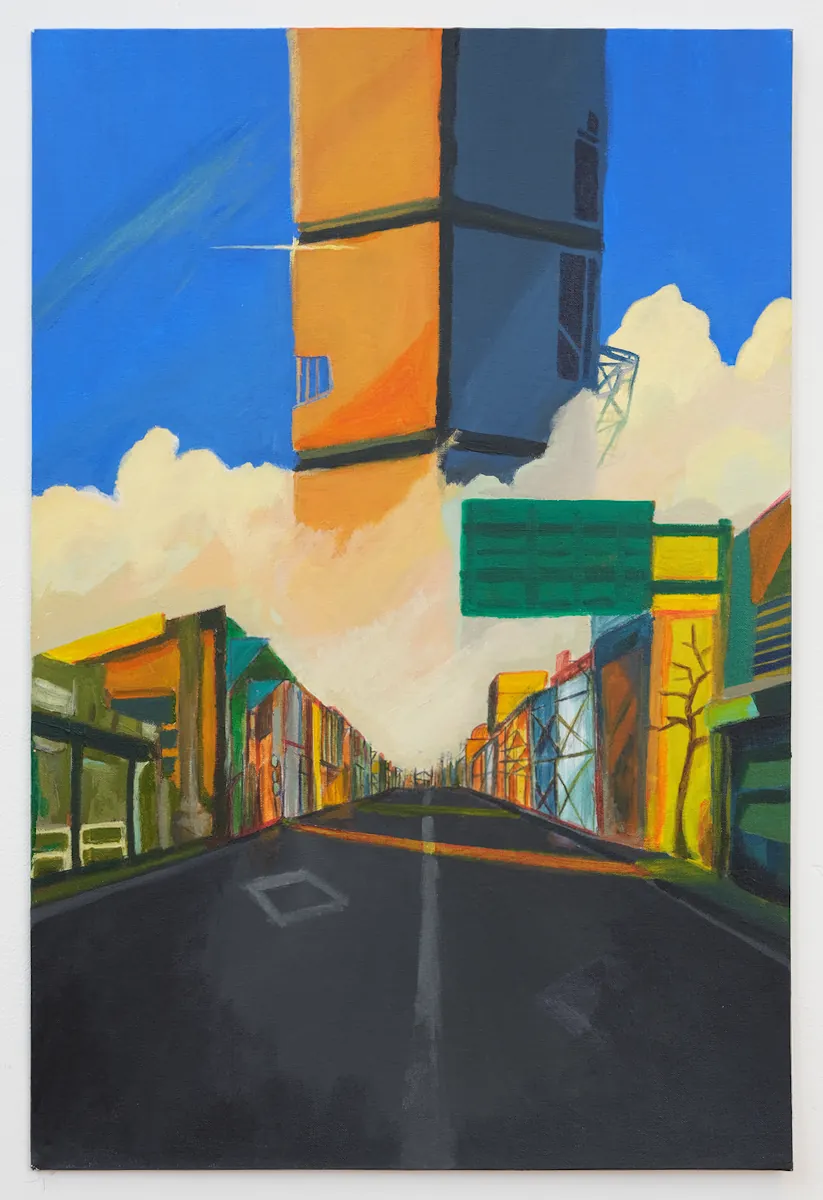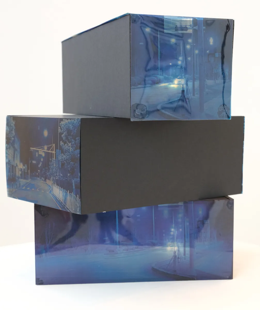 This piece explores the consequences of a society increasingly absorbed in the technological world. Digital screens are symbolized through the stacked rectangular black blocks. Desolate street scenes, devoid of life, highlight how modernisation fosters social regression, as we become more attuned to our online infrastructure than to our immediate physical surroundings. The bright blue tones create an eerie silence, prompting viewers to reflect on the growing detachment in contemporary urban life.