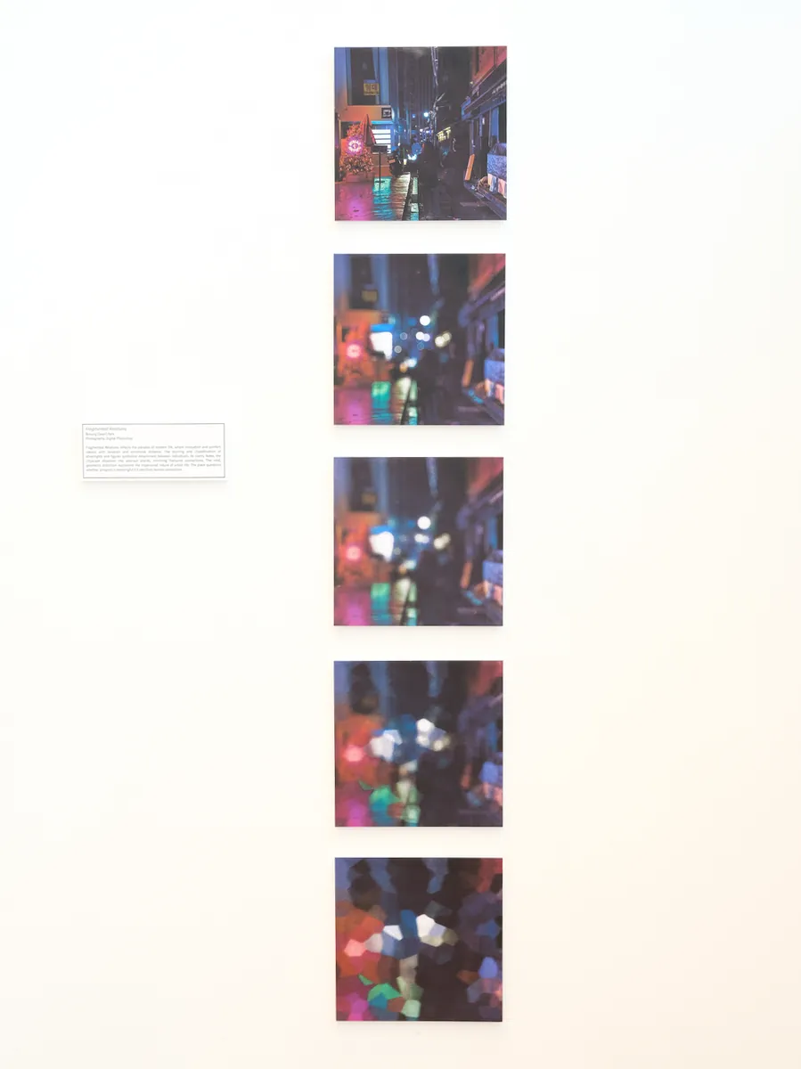Fragmented Relations reflects the paradox of modern life, where innovation and comfort coexist with isolation and emotional distance. The blurring and crystallisation of streetlights and figures symbolise detachment between individuals. As clarity fades, the cityscape dissolves into abstract shards, mirroring fractured connections. The cold, geometric distortion represents the impersonal nature of urban life. The piece questions whether progress is meaningful if it sacrifices human connection.