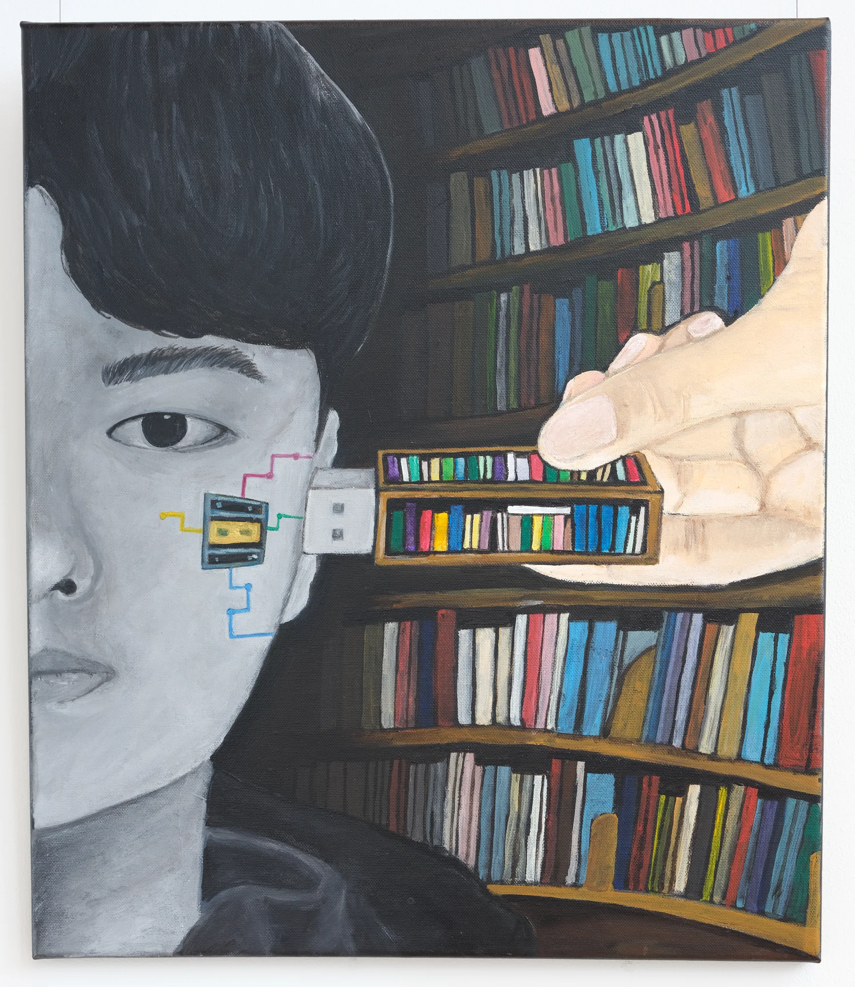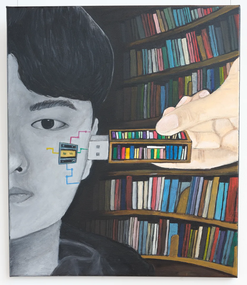 I aimed to explore the contrast between acquiring knowledge through technology and traditional books. After reflecting on this concept, I realized that a USB drive, commonly used to transfer digital information, could symbolize modern knowledge acquisition, while a person represents the receiver of this knowledge. I thought it would be creative to depict a robot inserting a USB into its head, illustrating how technology enhances our understanding. For the background, I painted a library to signify the traditional method of gaining knowledge through books. This composition highlights the collaboration between these two distinct ways of learning and knowledge transfer.