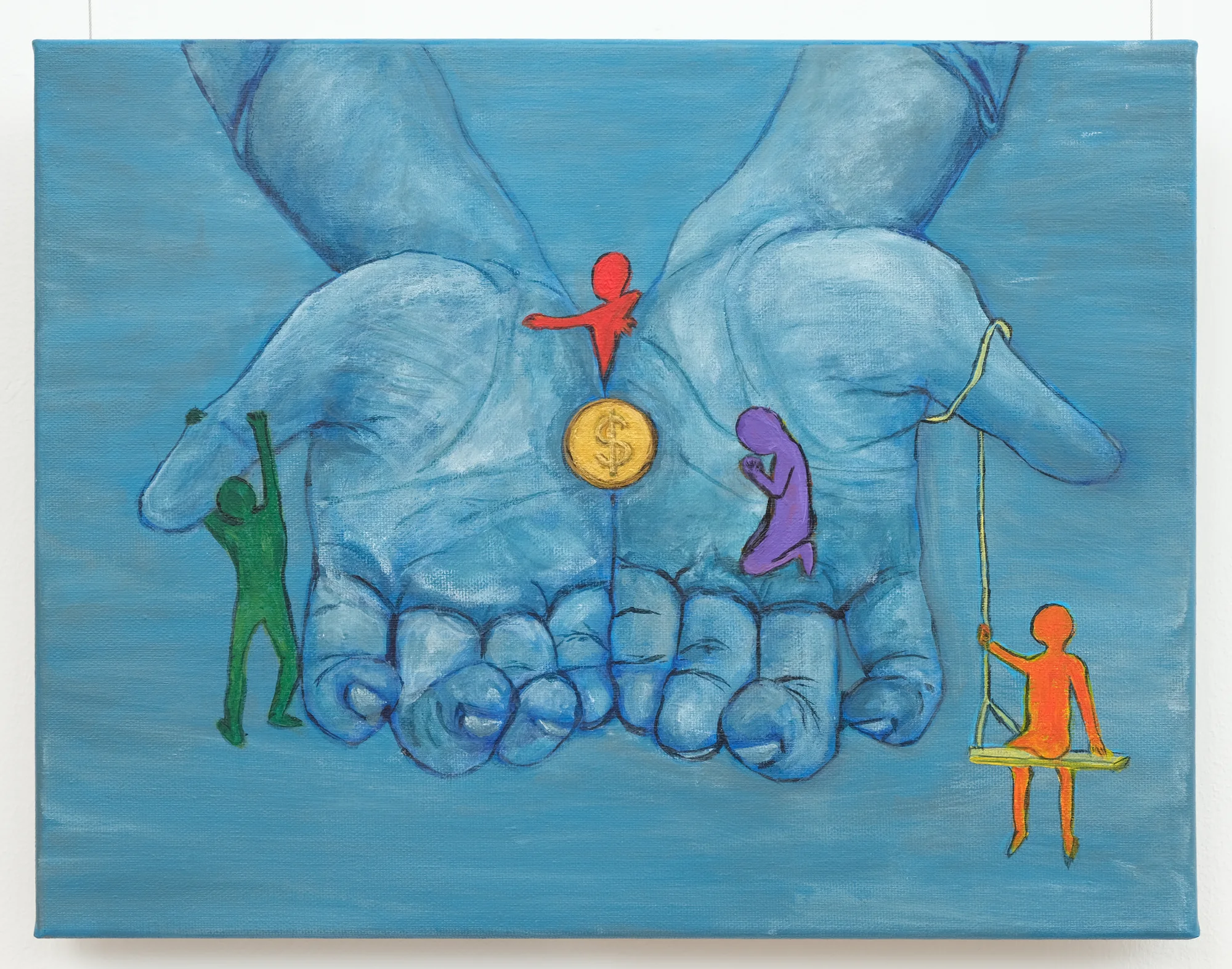 This work explores control and power, with gigantic hands grasping tiny human figures. Following the artistic movement of Betende Hände, the hands symbolize dominance and control, and the gold coin represents greed and unlimited craving. The painted human figures, representing citizens, are depicted being controlled as puppets, symbolizing the distortions of power in society. The blue monochromatic color enhances the sense of disconnection, asking if there is ever true freedom in a money-and-influence-run world.