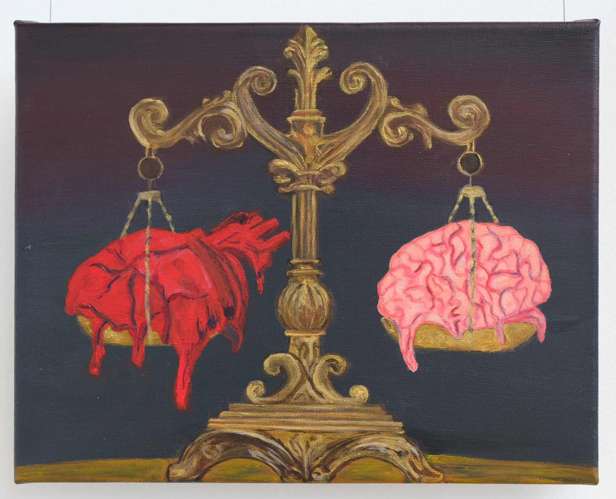 This artwork shows the contrast between emotional and rational behavior that symbolized by the heart and brain on the balance. The heart represents emotions and the mind, as the brain symbolizes rationality and logic. The scale represents the struggle between feelings and reason when people make their decisions. This was inspired by psychological and classical symbolism, which reflects the common mindset that human has.